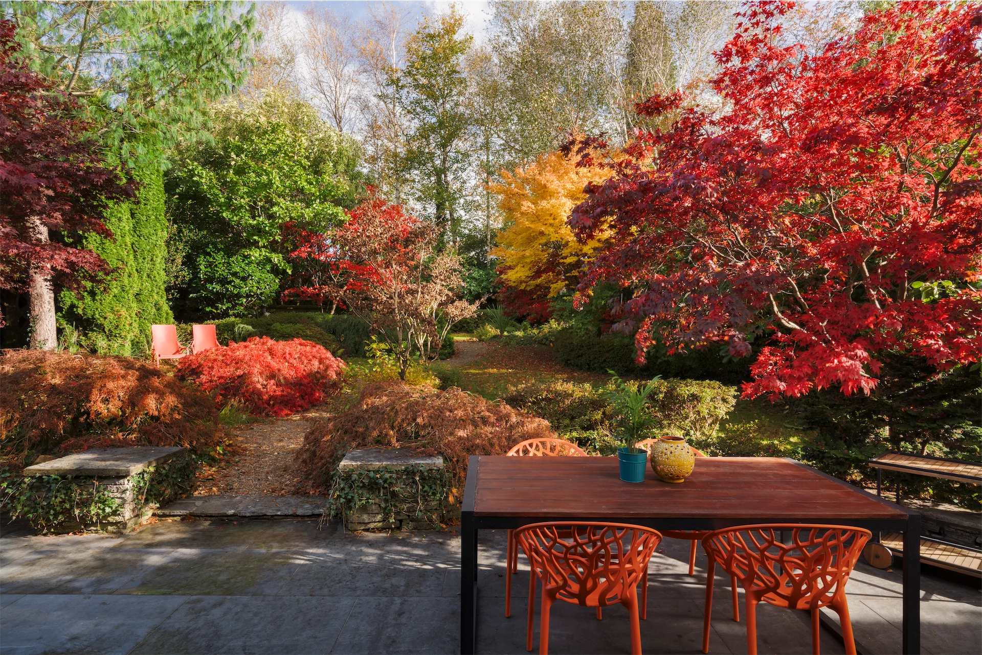 The tones of the ‘70s—reds, oranges, browns—and bold patterns are seen throughout, a vibrant colour palette that’s embraced across each and every room. There are retro sideboards and console tables here and there, and the same flooring connects the entire home.