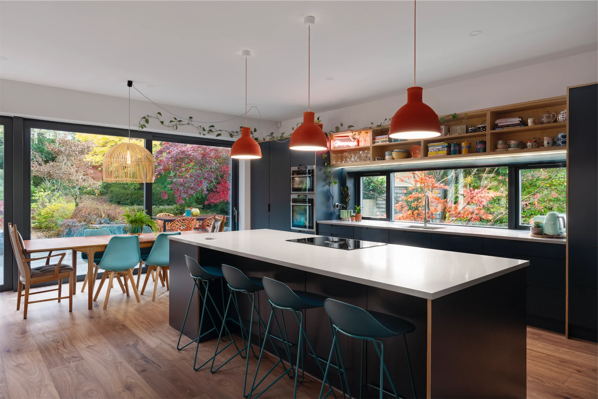 The exterior of the home is sleek, veering towards a contemporary modern aesthetic, and while the space maintains a strong physical connection to the outside world, it absolutely buzzes with fun and personality.