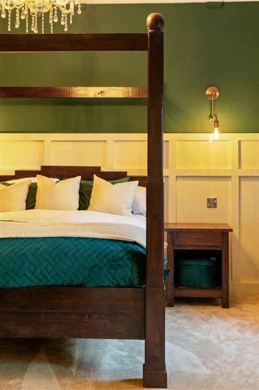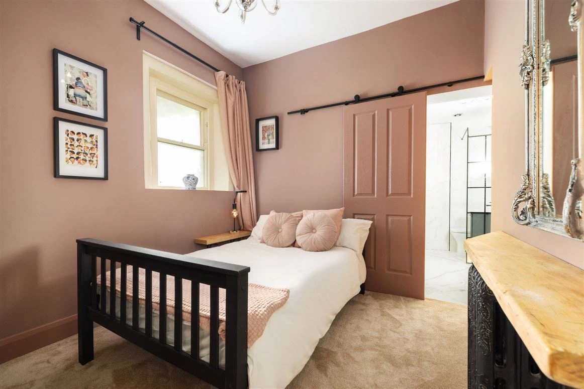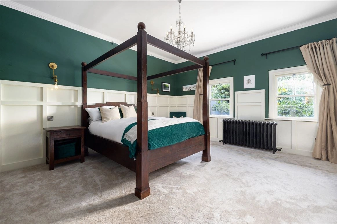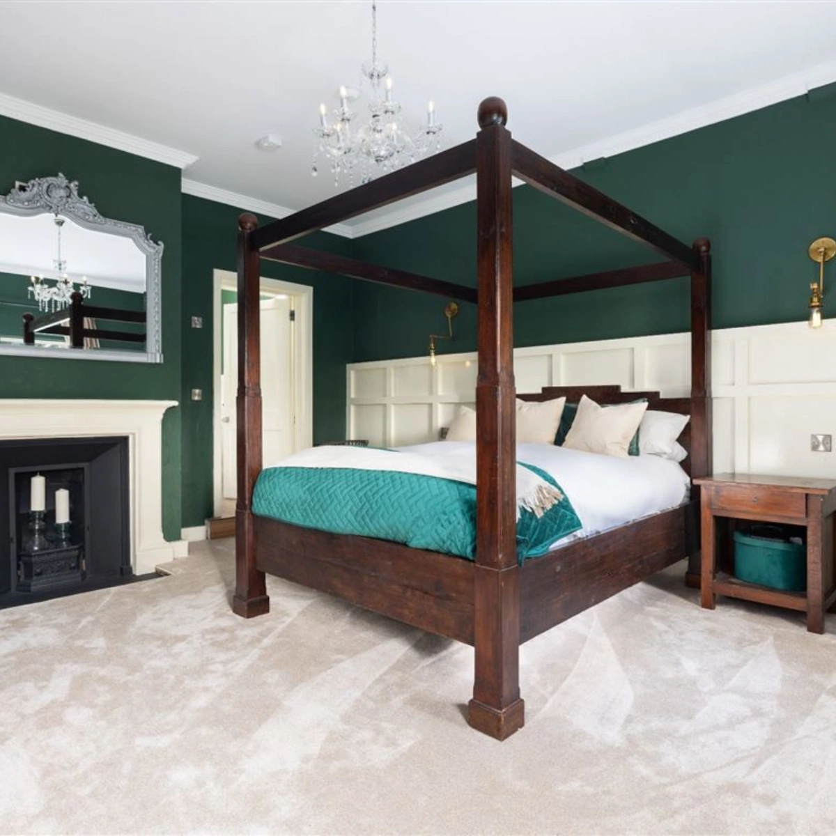 Three bedrooms, two of which are ensuite, complete the accommodation. The principal bedroom suite has its own fireplace with period surround, a pendant chandelier and lush carpeting. Panelling features in both this room and the luxury ensuite bathroom which has a tiled floor, impressive repro-Edwardian multipoint glazed shower cabinet, Heritage period-style wash basin, and a roll-top claw-foot free-standing bath.