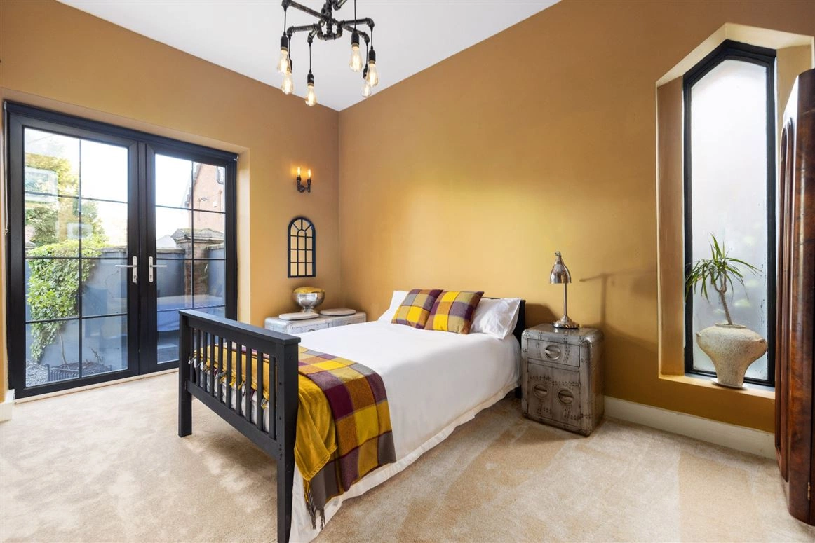 The second bedroom is a dual-aspect room with direct garden access thanks to glazed patio doors leading outside. The third bedroom features the same lush carpeting, a chandelier pendant, and a sliding door out to the ensuite wet room and shower.
