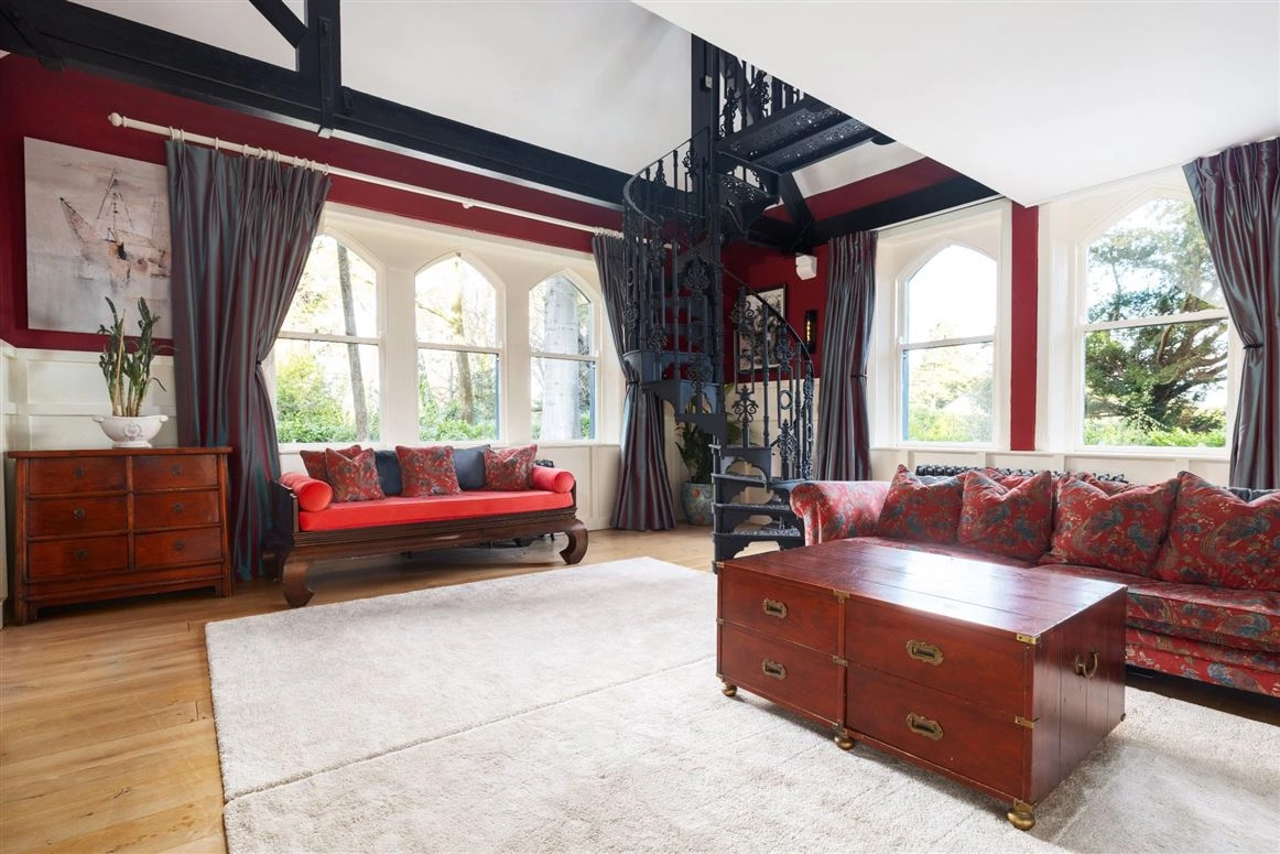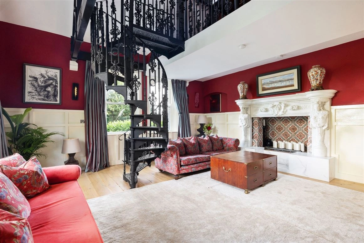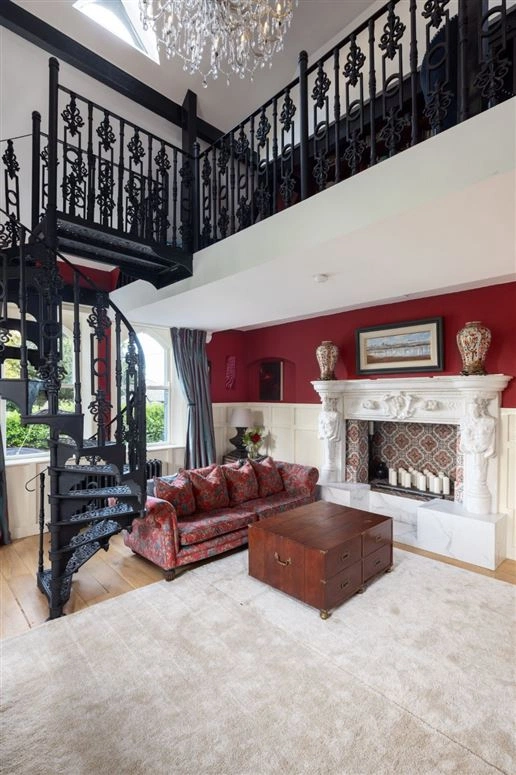 The ground-floor apartment is accessed from the car-packing bay, which leads through a wonderful outdoor terrace area up to the front door. A tiled hallway with a period fireplace surround welcomes you inside. This leads into the dual-aspect living room which features a mezzanine gallery library with exposed beams and an ornate marble fireplace.