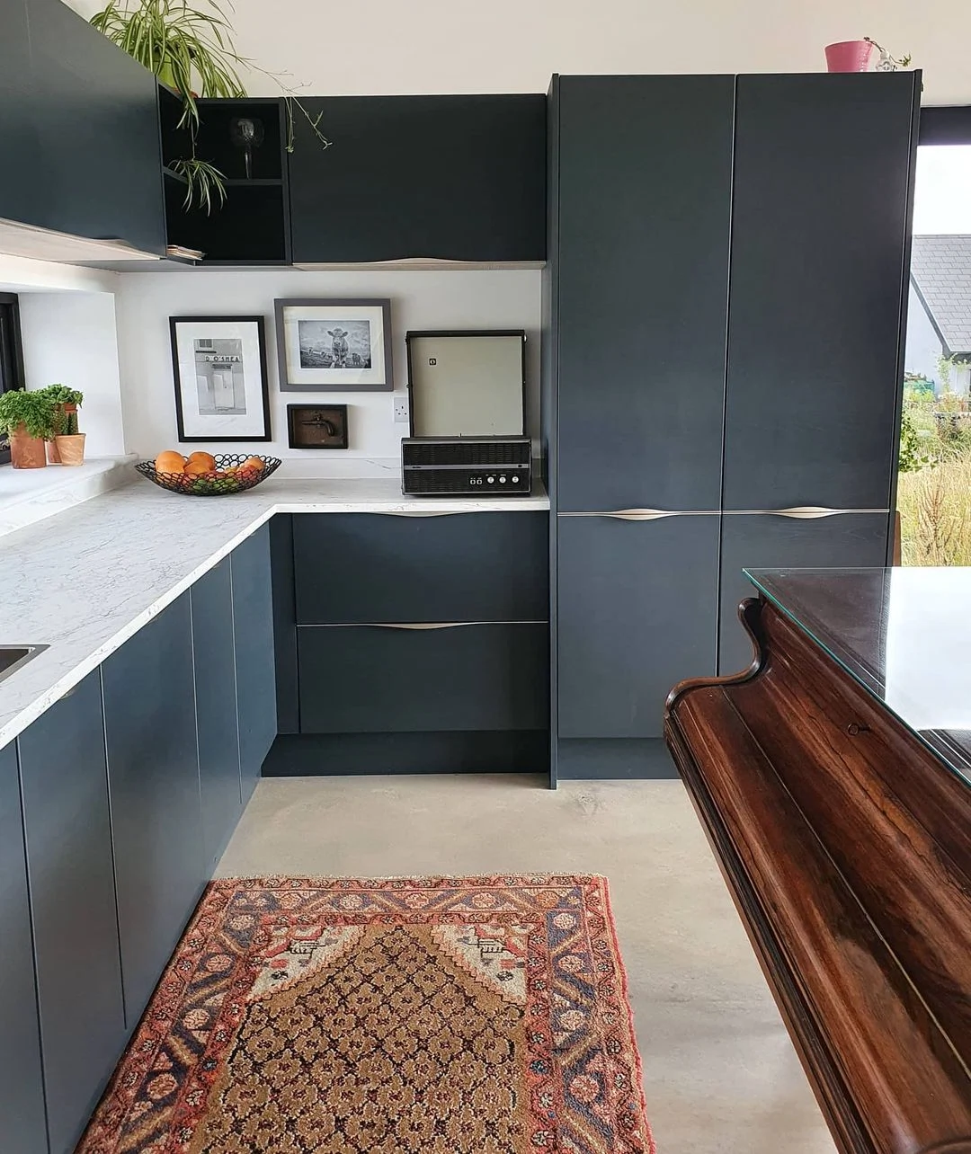 In the kitchen, simple navy-grey units and a white stone countertop allow David’s island, a vintage piano, to do all of the talking. A pantry and fridge are tucked behind a sliding door that disappears completely when closed.