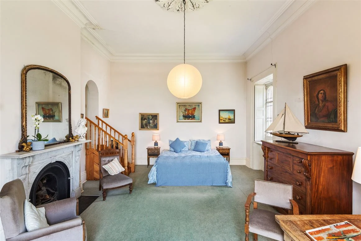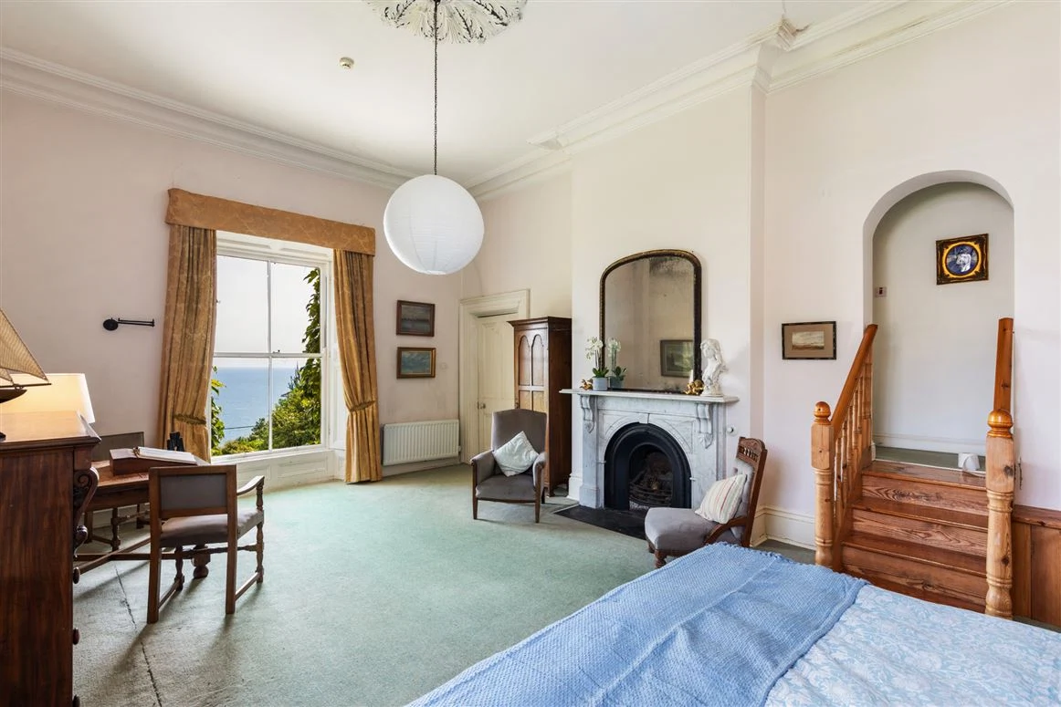 The breathtaking views over Killiney Bay are complimented by the property’s enchanting grounds, which feature a selection of mature plants and shrubs, including old roses, hydrangeas, cranesbill, lobelia, and fruit trees. A lawned tennis court at the rear awaits restoration, while the distinctive granite tower, known as “Spite Tower,” adds unique character and potential for various uses.