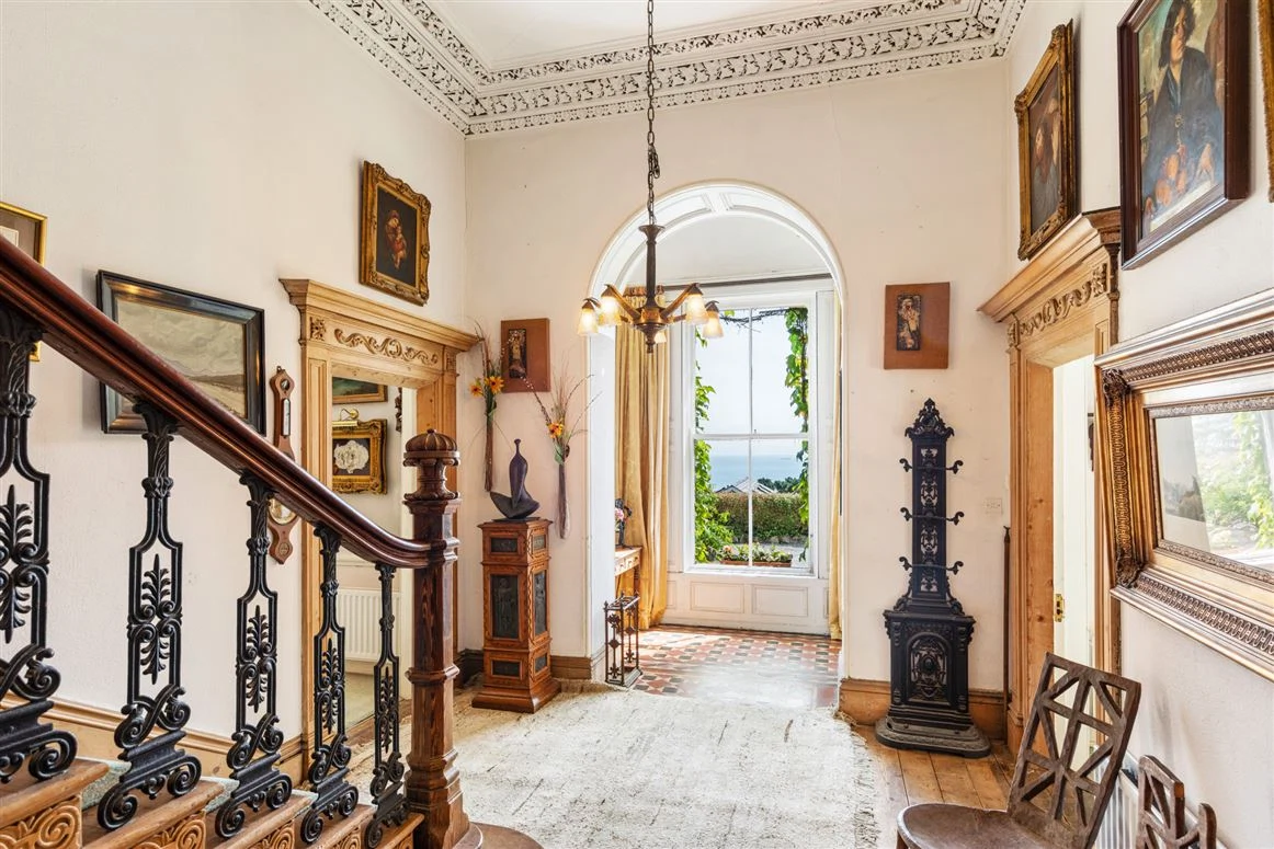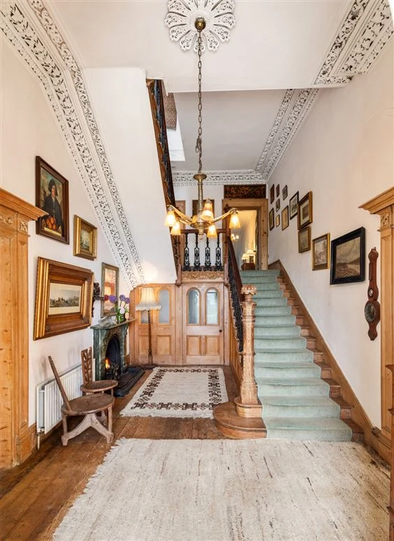 Upon entering the impressive main hall, you are greeted by two exquisite formal reception rooms, the drawing room with double-aspect windows, intricate and ornate ceiling coving throughout, and attractive marble fireplaces.