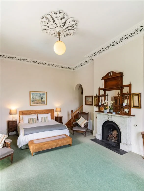The property displays a wealth of original features, including ornate cornicing, ceiling roses, stunning fireplaces, and functional shutters. Original floorboards and stripped pine doors with over-architrave details add to its historical allure.