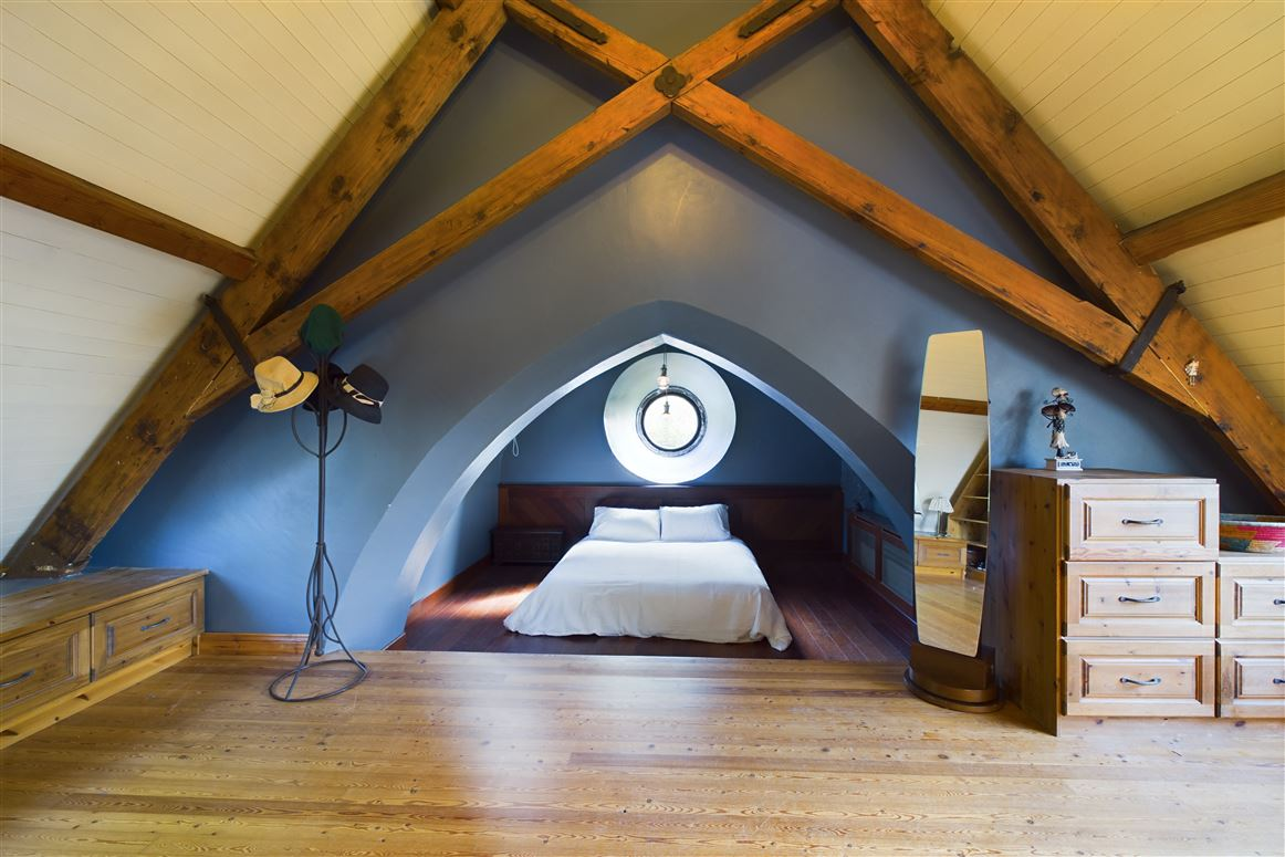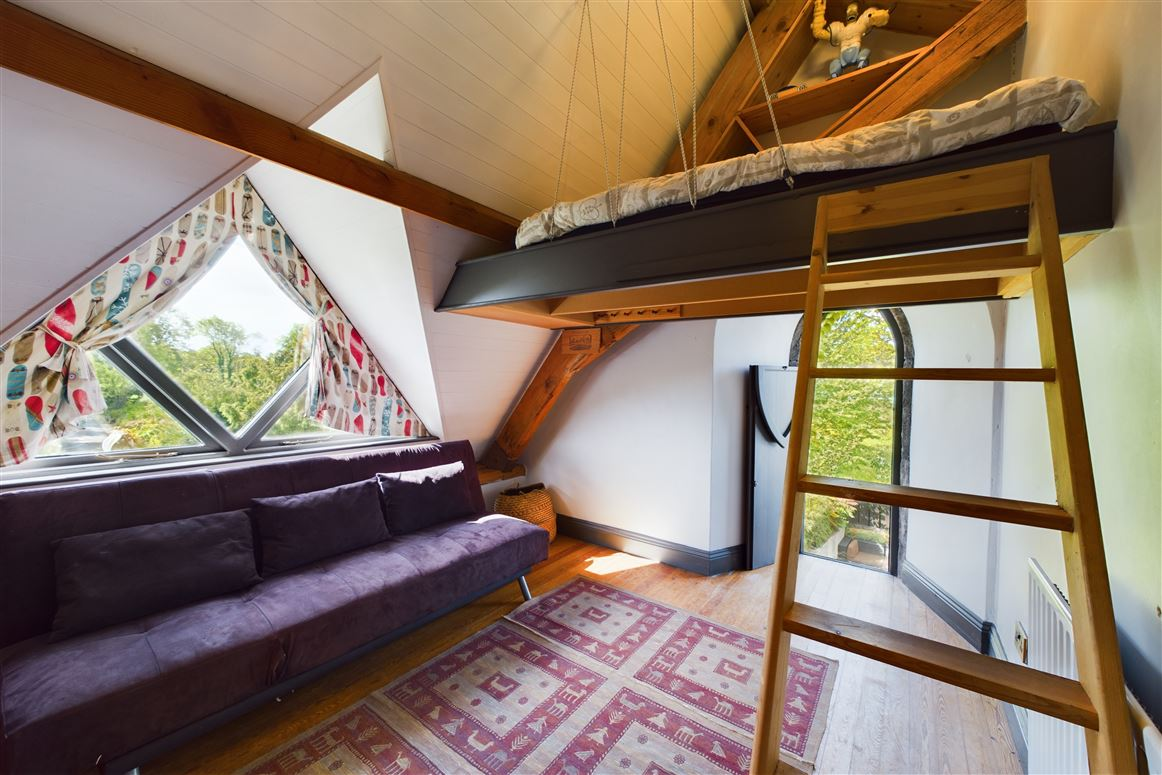 Upon entering the porch, the original mosaic-tiled aisle guides you through the living room to the dining area and elevated kitchen, which formerly housed the church altar. Off the kitchen, the vestry is now a cold room/pantry. An open thread oak staircase ascends from the living room to the first floor, featuring three bedrooms and a bathroom. The principal bedroom includes a storage and dressing area with a recessed sleeping space.
