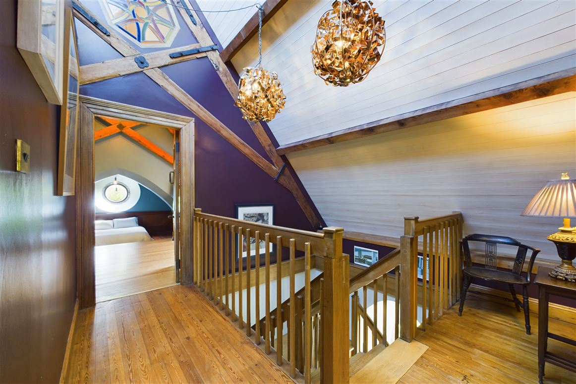 Throughout the home, numerous original features have been preserved, including mosaic floors, exposed oak A-frames, and some of the original diamond fenestration on the interior. New purlins were crafted from local douglas fir. The floors are made of pitch pine salvaged from the old Graves Hardware building, as is the fireplace beam. The kitchen is also constructed from pitch pine repurposed from the salvaged staircase of Graves Ltd. Upstairs, the floors are Irish larch, while the kitchen and new extension floors are Indonesian merbau.