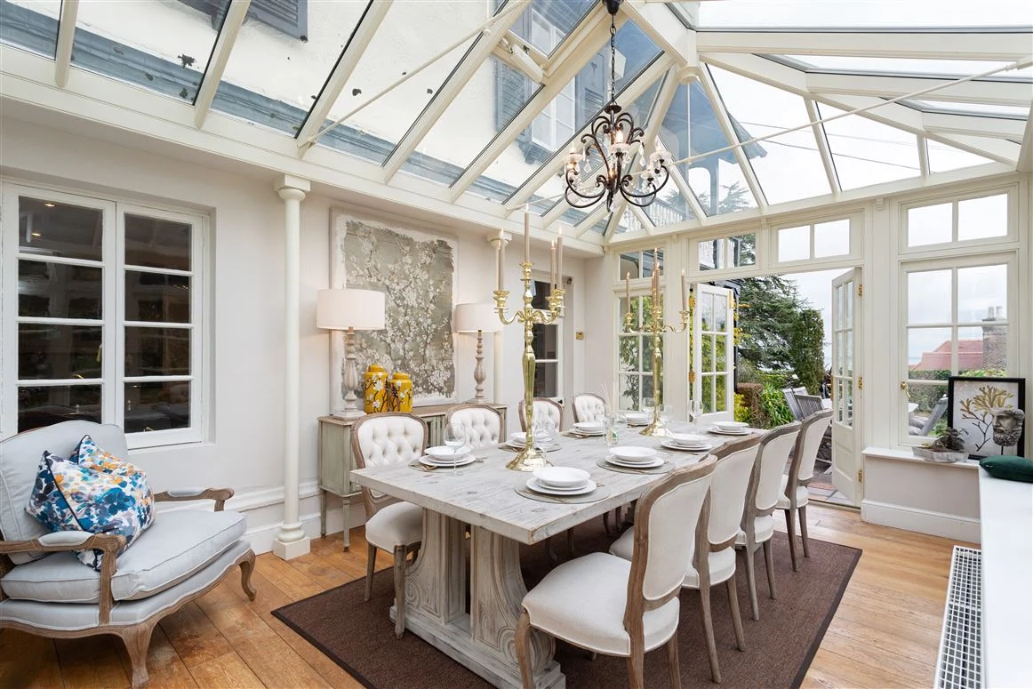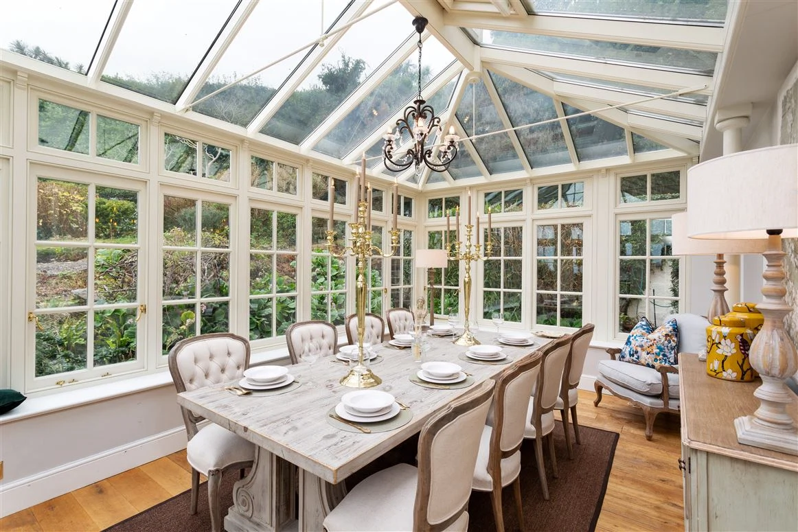 The lightness of the kitchen comes courtesy of the stunning conservatory, currently used as a more formal dining room. Sheltered by the sloping lawns and with French doors out onto the patio and terrace, it connects all of the outdoor living spaces together.