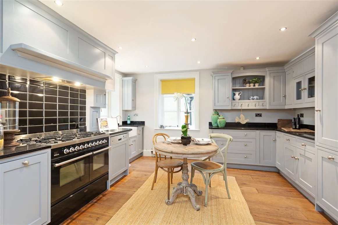 Past the central staircase is the kitchen, a bright and airy room with a beautiful grey country kitchen and stove, as well as a casual dining area. There is also a large utility room tucked away.
