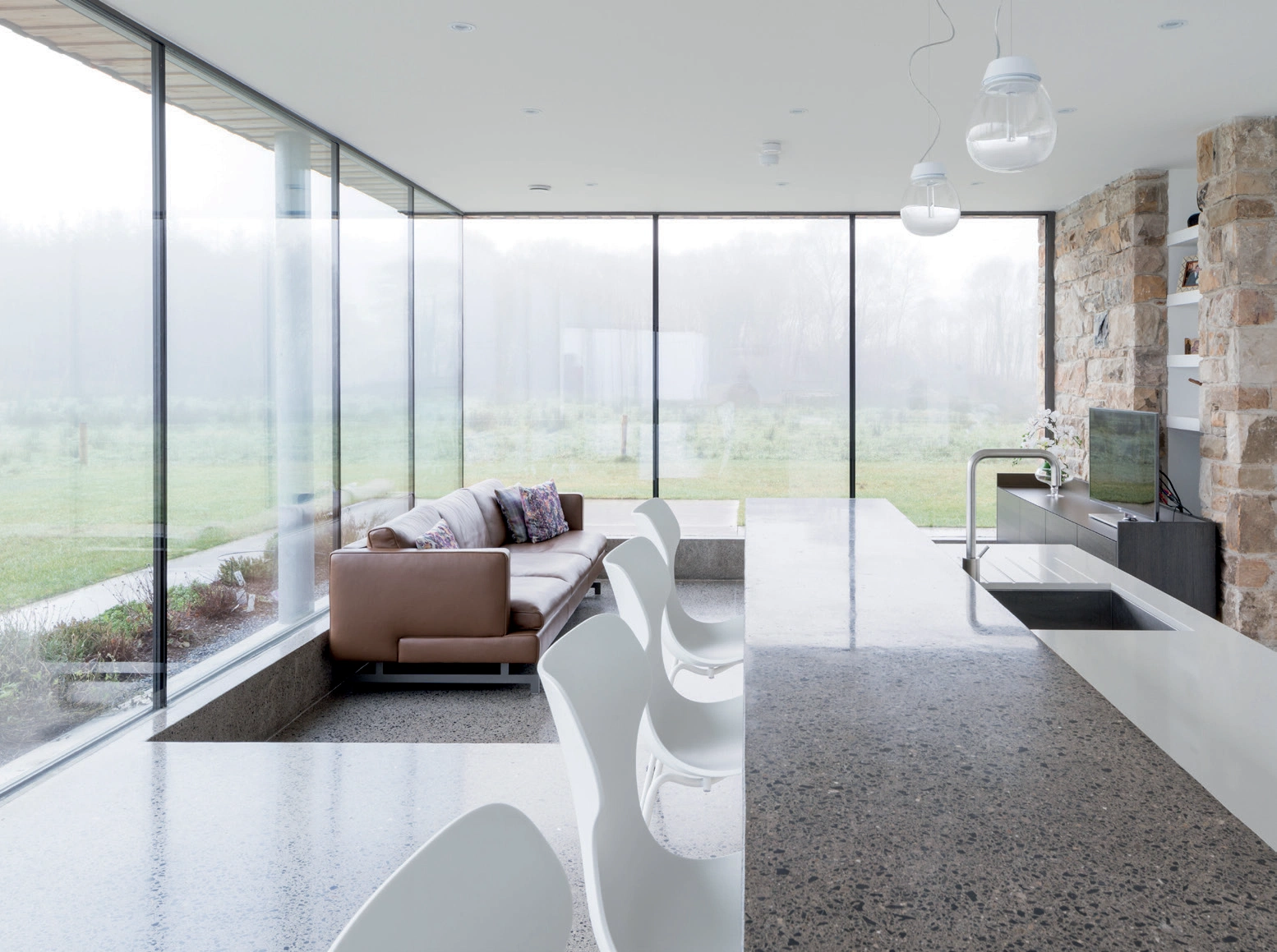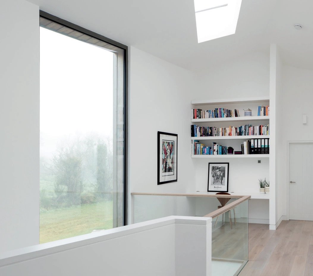 The house faces its focal point, the lake, while the rear, facing north to the woods, is more solid. This clever orientation gives an enviable A3 energy rating, which had been one of the client’s priorities. Following that and taking note of the required accommodation, and those glorious views, the house began to take shape. That natural stone spine wall, coming from the outside in, is a favourite feature, as is the sculptural- looking form, hovering above the landscape.