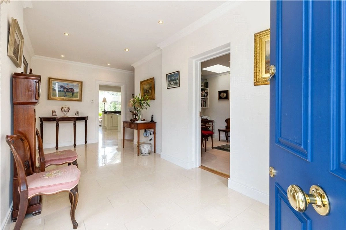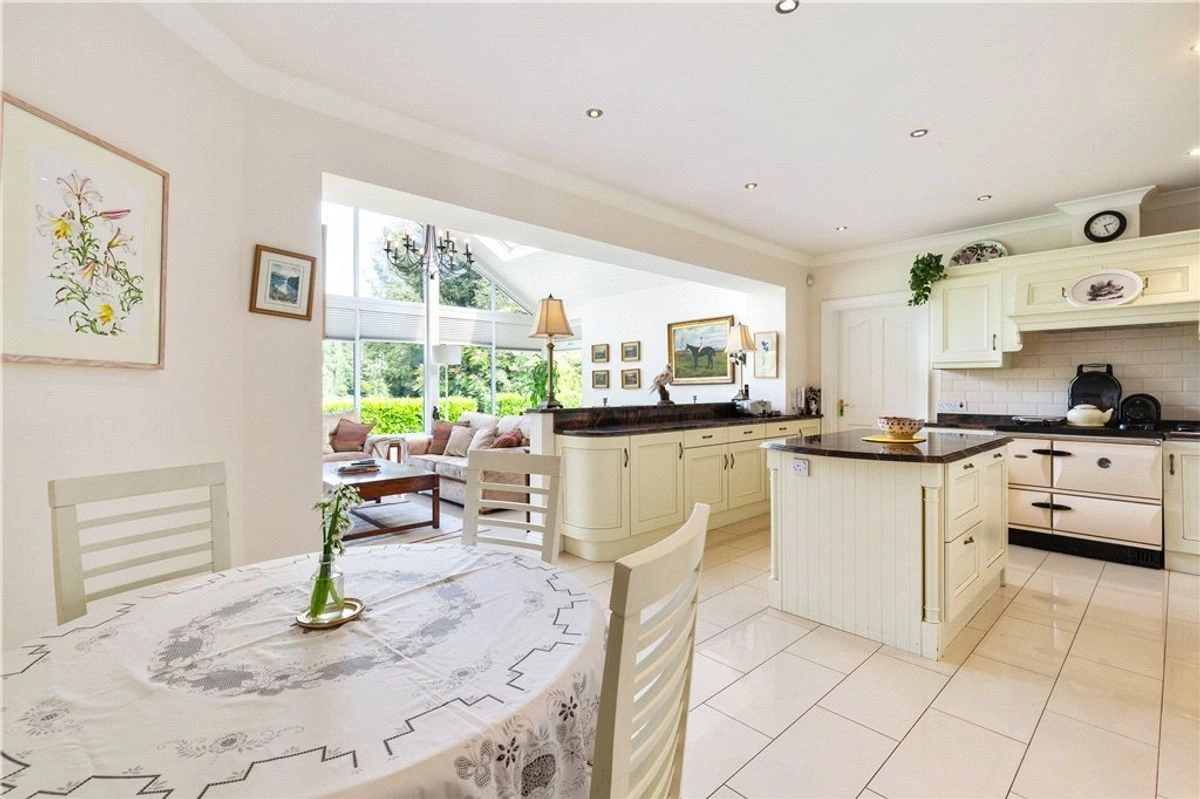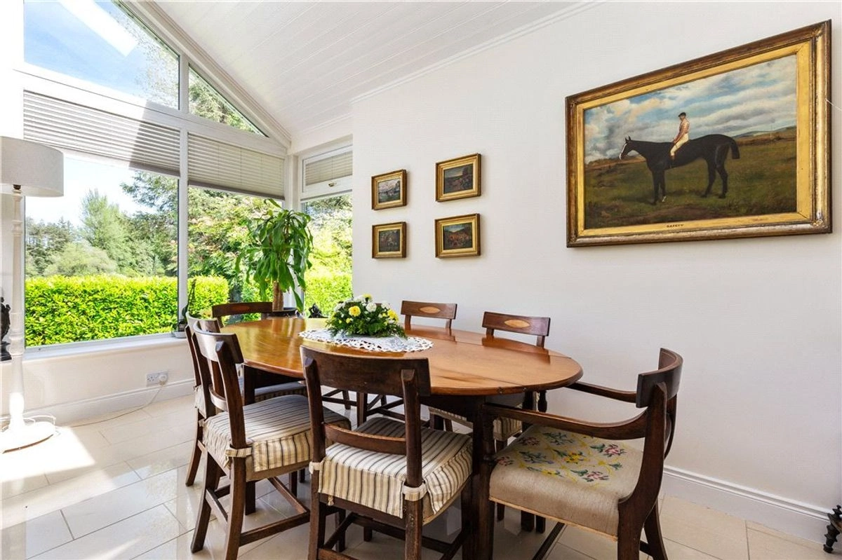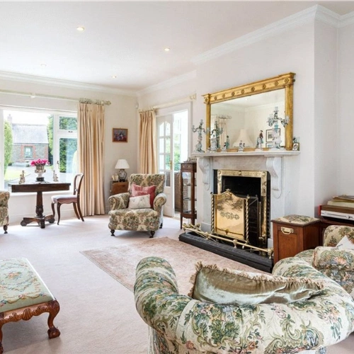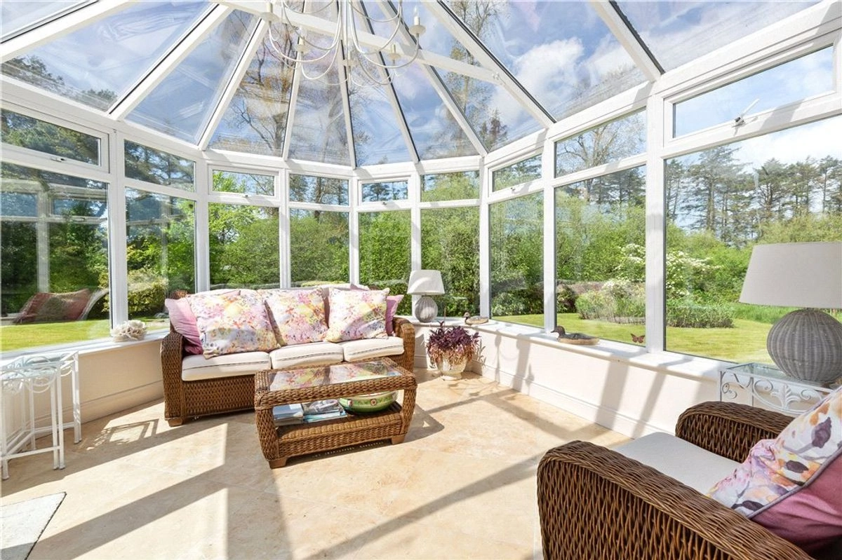 The main residence has undergone extensive renovations in recent years. A grand entrance porch opens onto a spacious hallway. To the left, is the family room where you’ll find a luxurious marble fireplace and sweeping vistas of the lake. Adjacent to this room is a stunning Victorian-style glass conservatory, strategically positioned to make the most of the sunset.