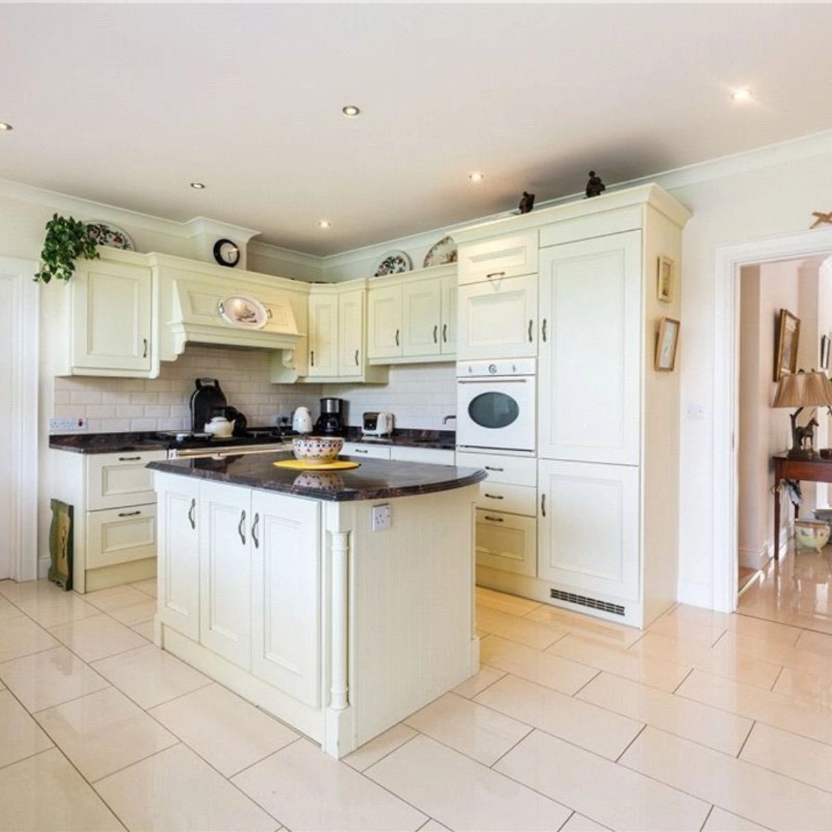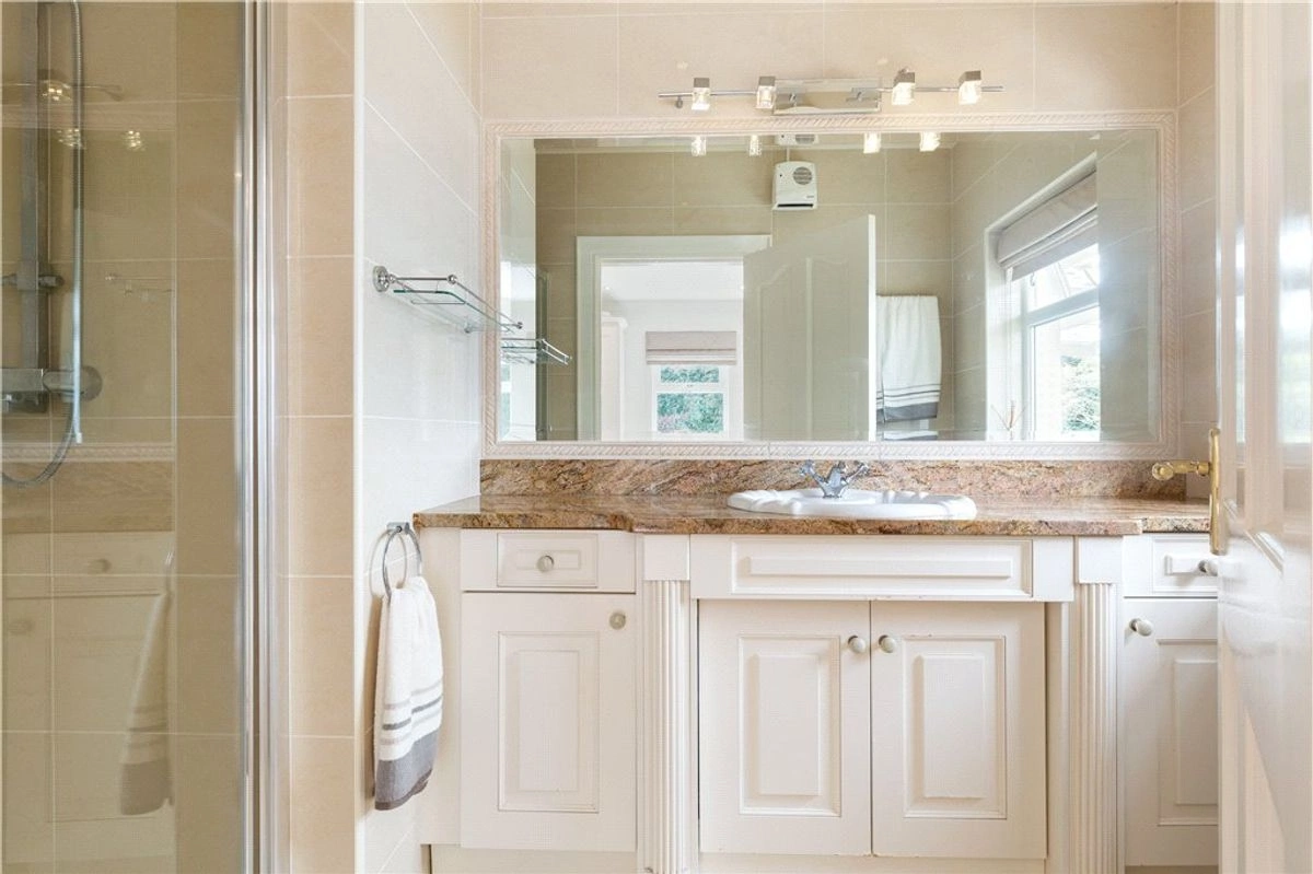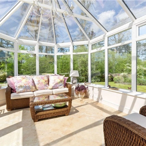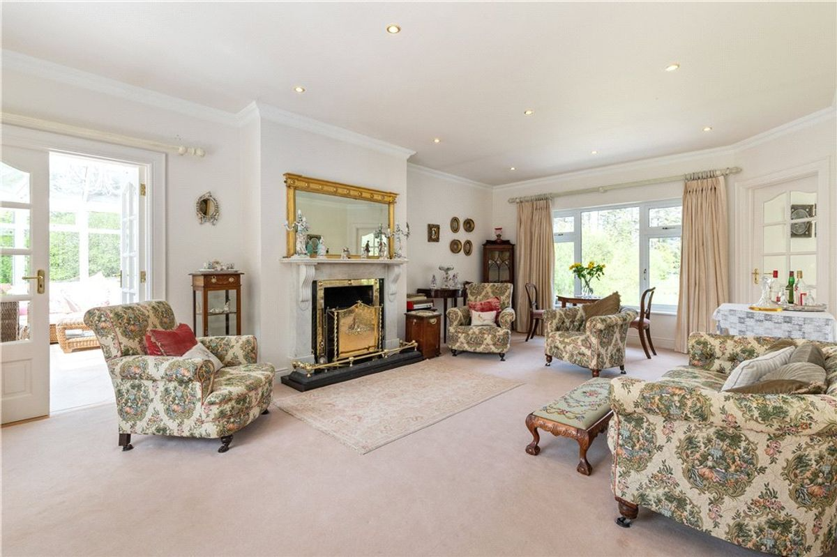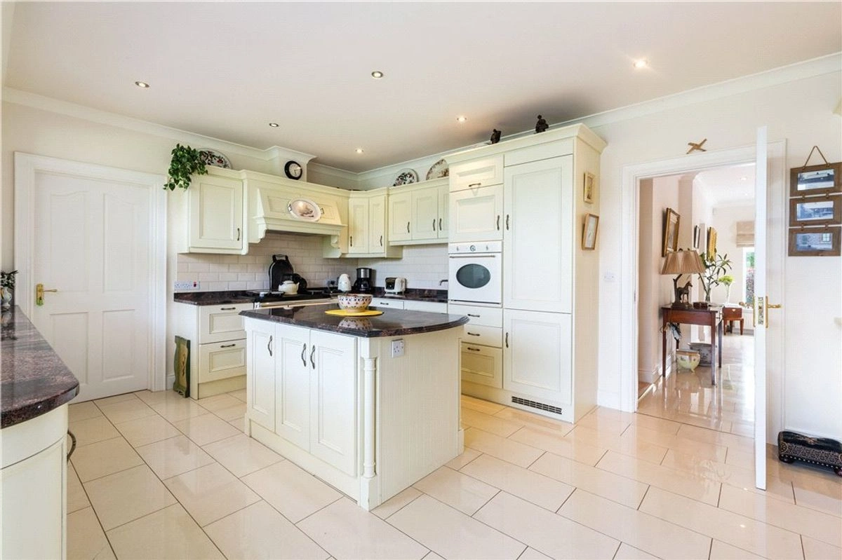 The main residence has undergone extensive renovations in recent years. A grand entrance porch opens onto a spacious hallway. To the left, is the family room where you’ll find a luxurious marble fireplace and sweeping vistas of the lake. Adjacent to this room is a stunning Victorian-style glass conservatory, strategically positioned to make the most of the sunset.