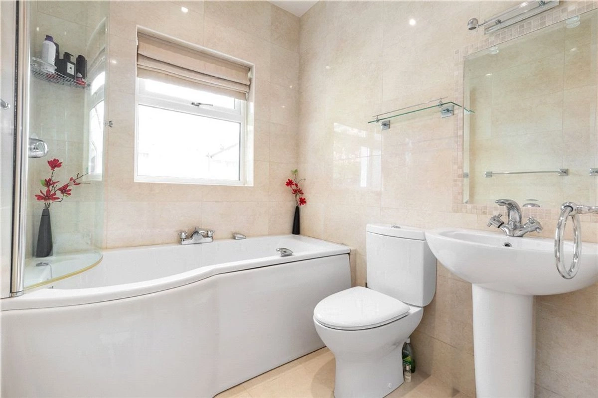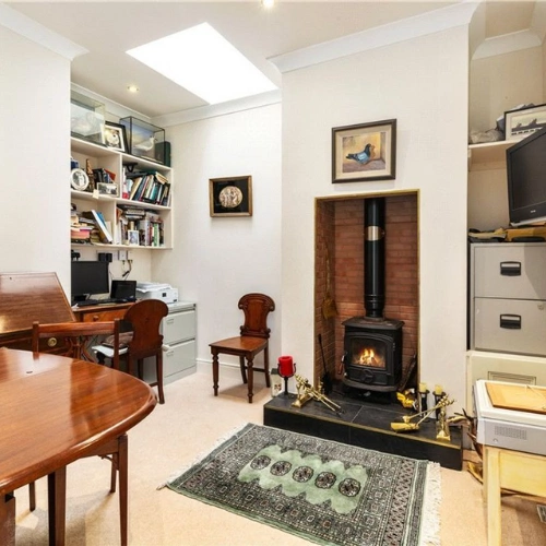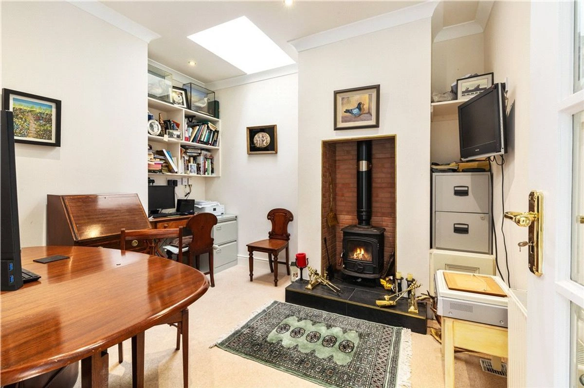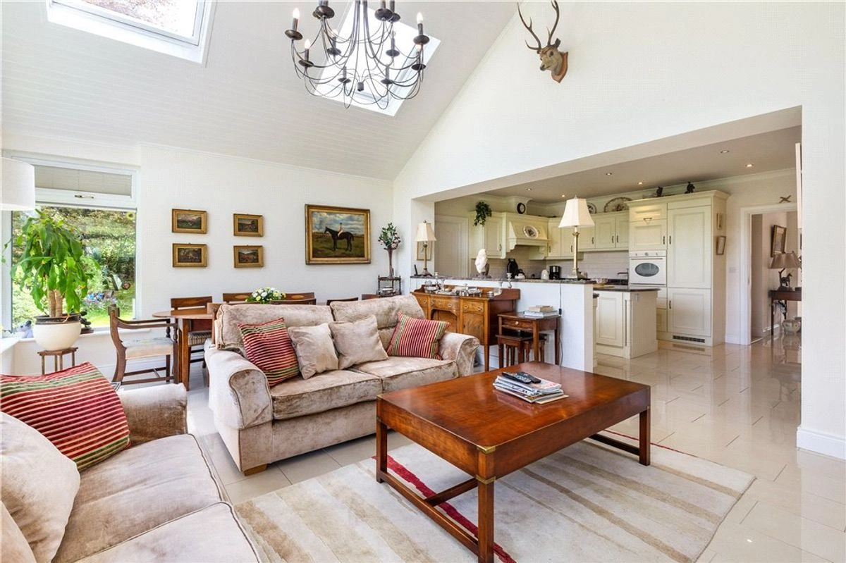 Further inside is the open-plan kitchen/living/dining area. A statement window, 4.3 metres high and 6.2 metres wide sits against the back wall, overlooking the garden and allowing natural light to flood the space. This expansive area is tailor-made for hosting gatherings, further enhanced by a supplementary kitchen/utility room complete with a convenient WC.
