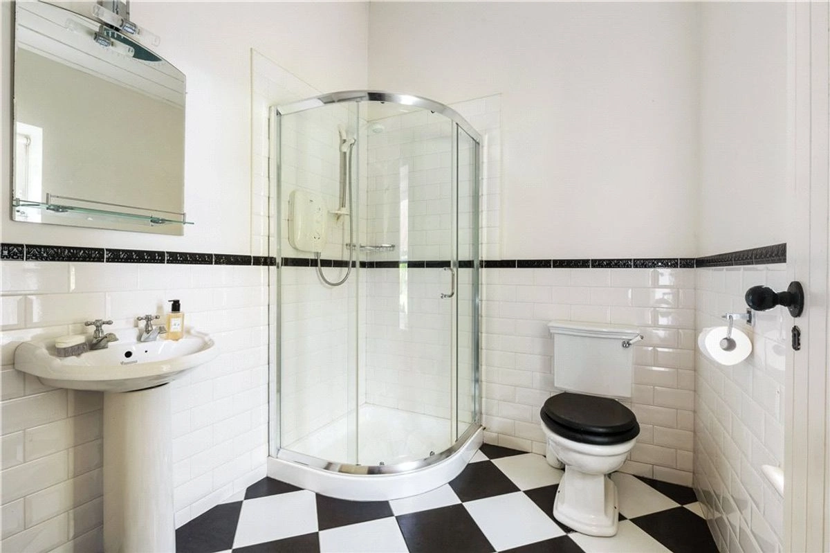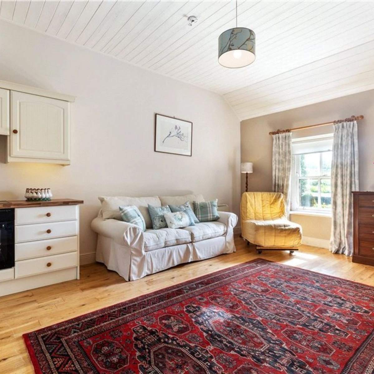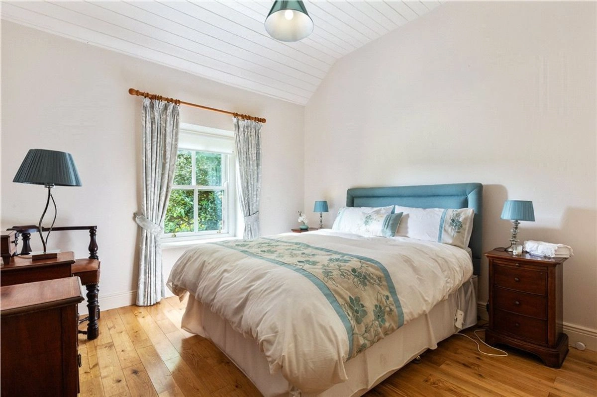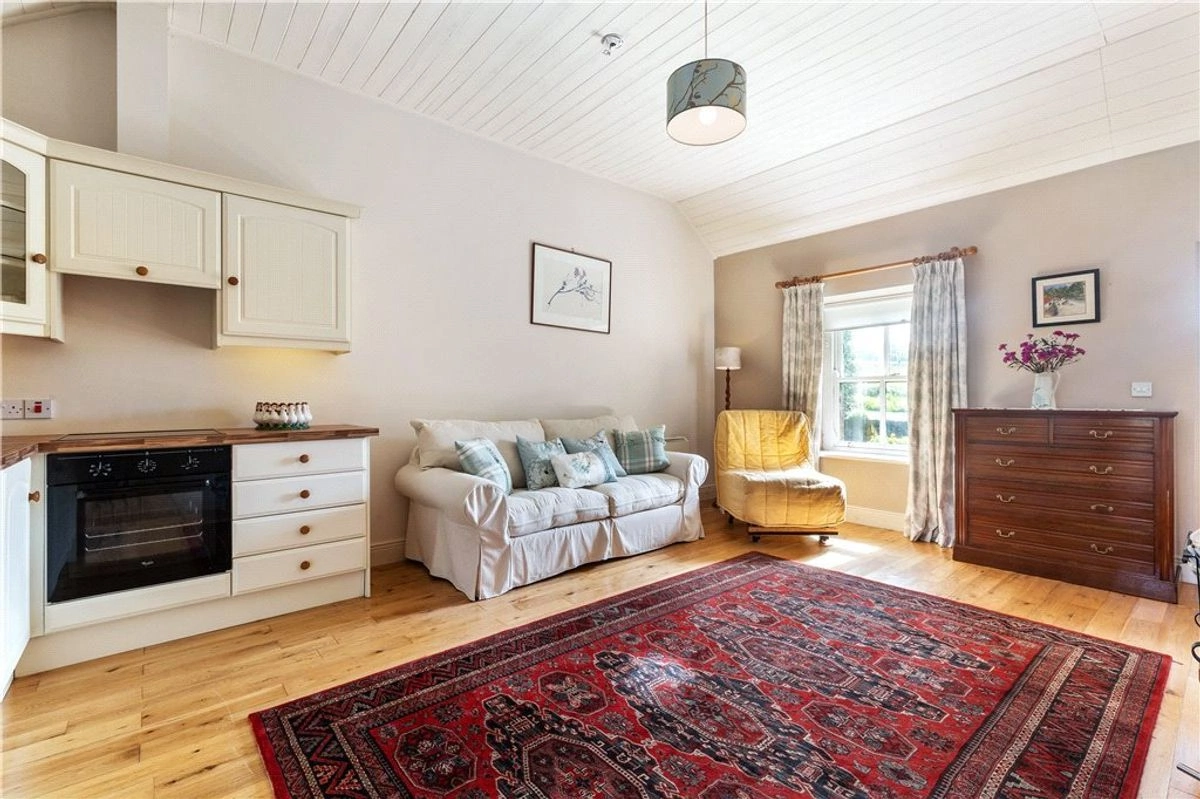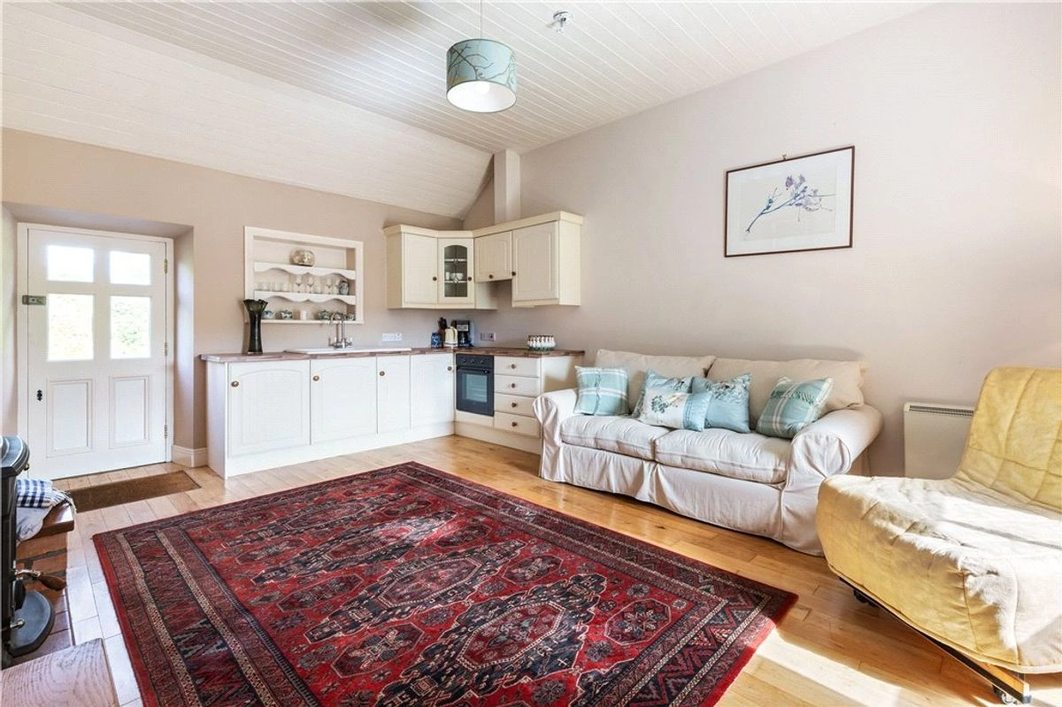 A traditional stone-front cottage can be found nestled elsewhere on the property. Fitted with double-glazed sash windows, the building is open-plan in its design and boasts a harmonious blend of modern comfort and rustic charm. Highlights include solid wood flooring, a classic Belfast sink, and lofty pitched ceilings along with a cosy wood-burning stove, perfect for colder evenings.