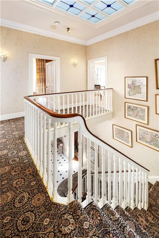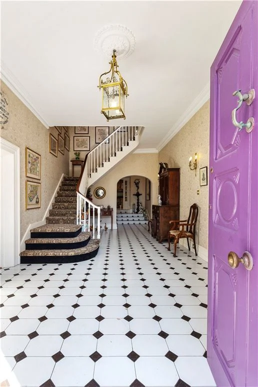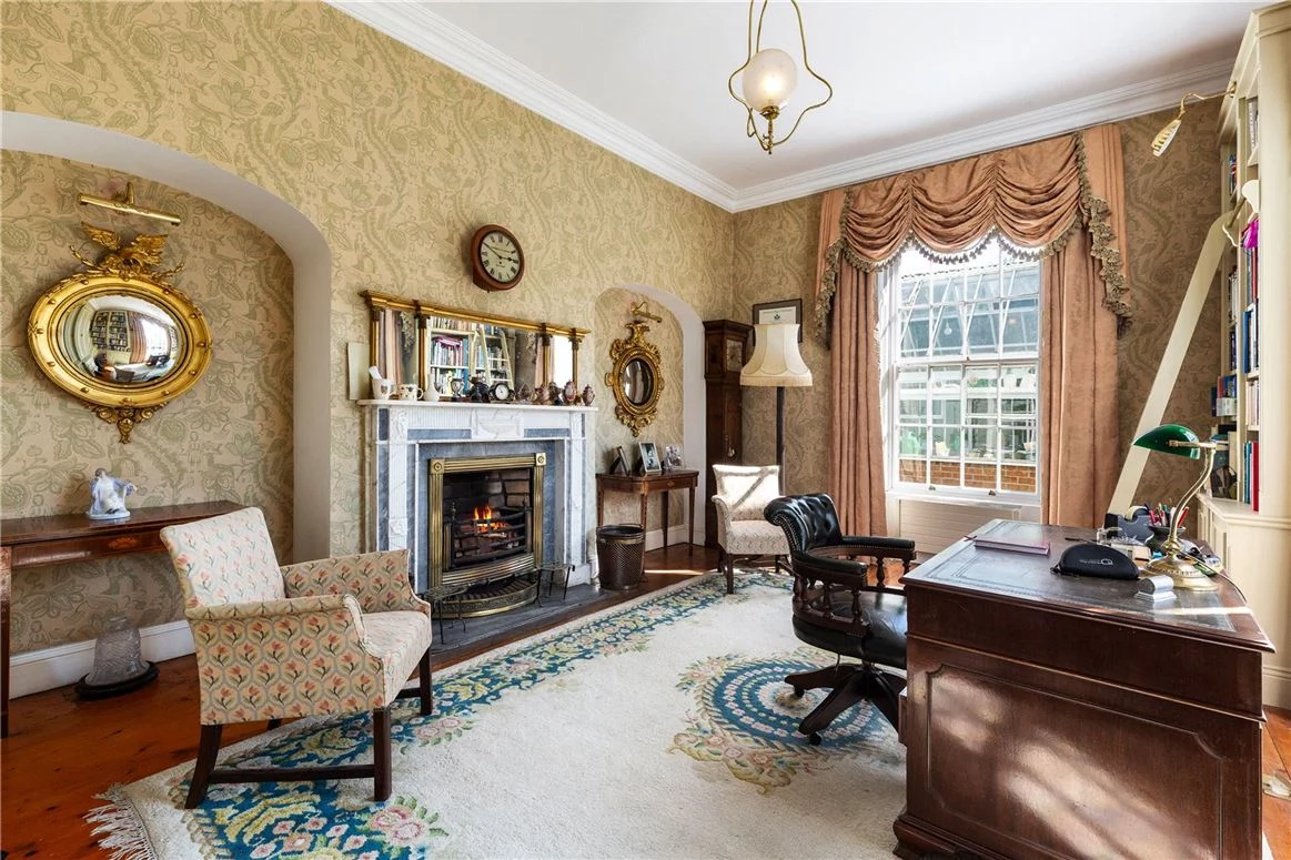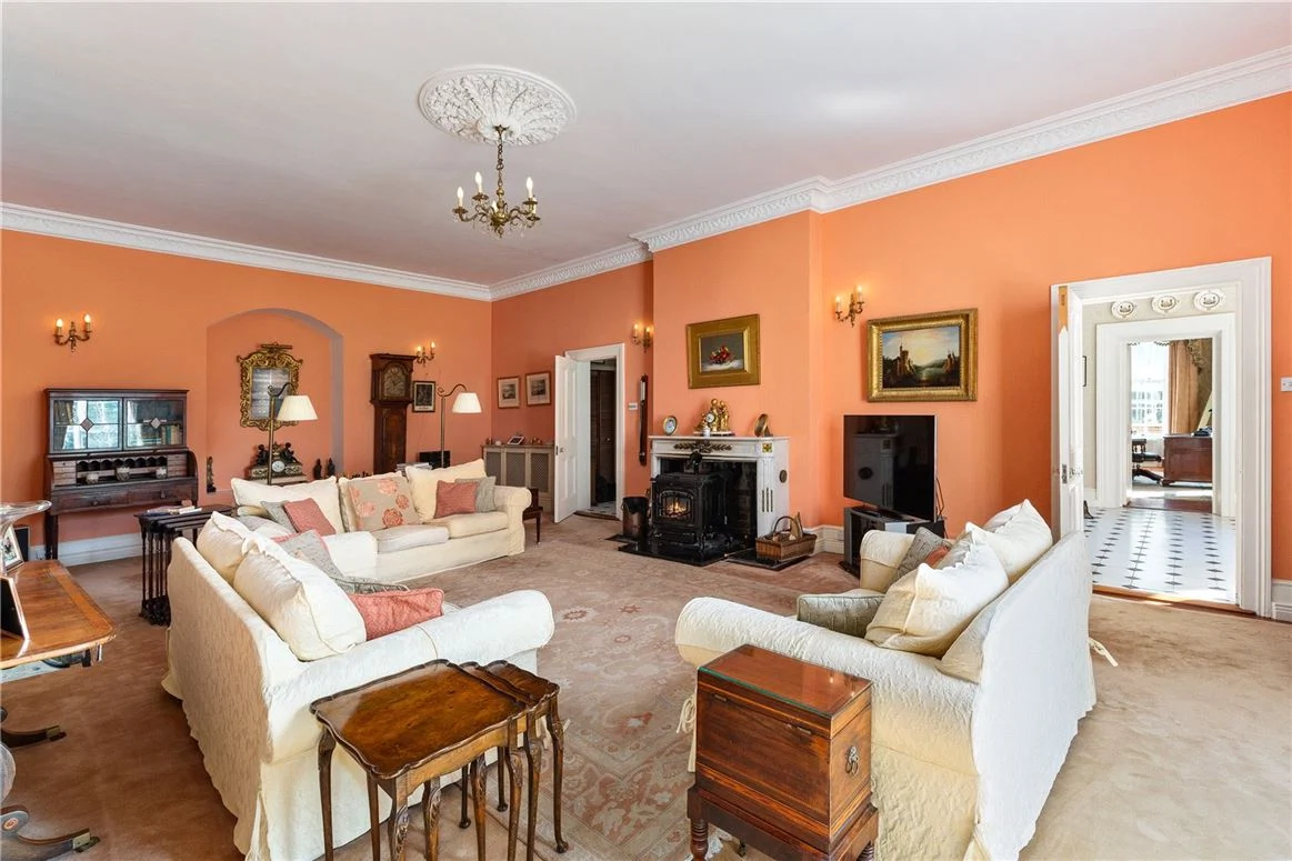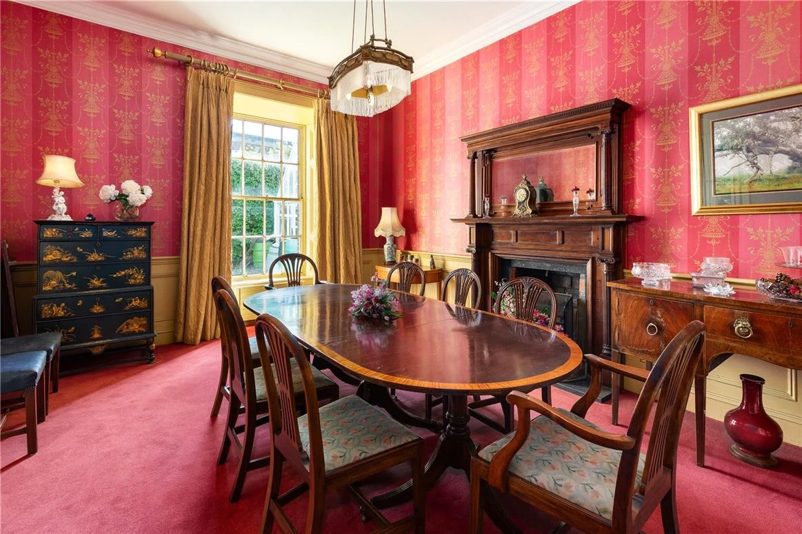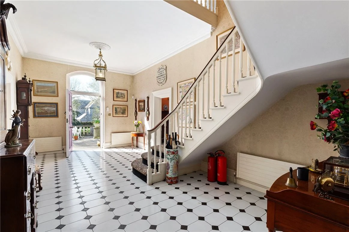 Approached through stone piers with cast-iron gates, the property is set within mature gardens and specimen trees, offering exceptional privacy. The accommodation extends to approx. 4,711 sq ft (437 sq m) over two storeys and retains a wealth of period features including sash windows with working shutters, ornate coving, ceiling roses, panelled doors, marble and timber fireplaces and high ceilings.
