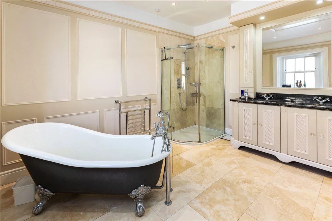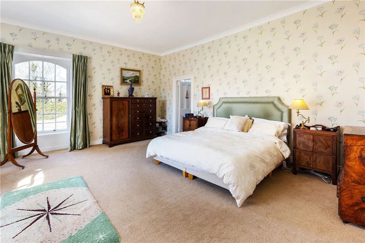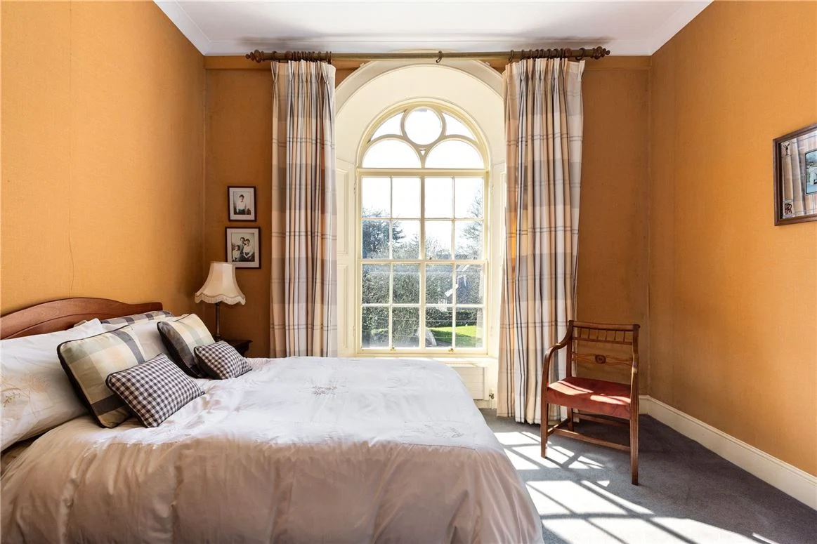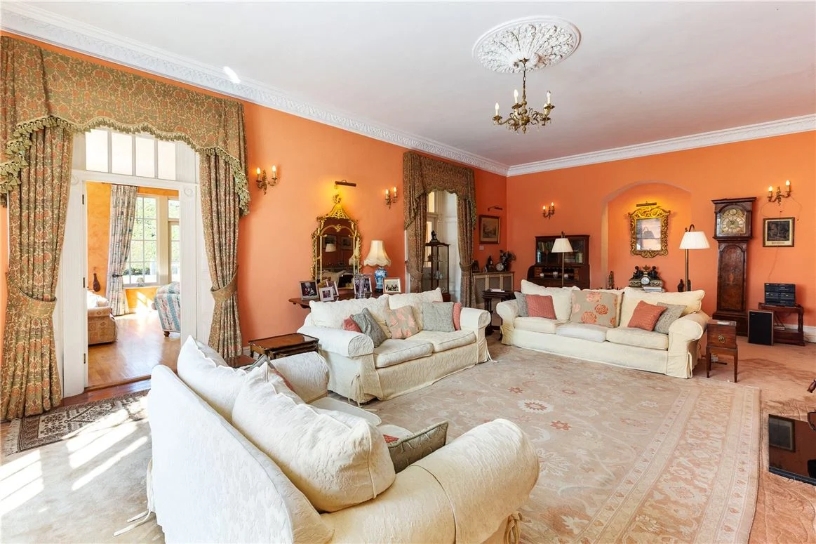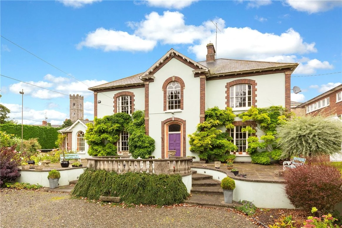 Approached through stone piers with cast-iron gates, the property is set within mature gardens and specimen trees, offering exceptional privacy. The accommodation extends to approx. 4,711 sq ft (437 sq m) over two storeys and retains a wealth of period features including sash windows with working shutters, ornate coving, ceiling roses, panelled doors, marble and timber fireplaces and high ceilings.