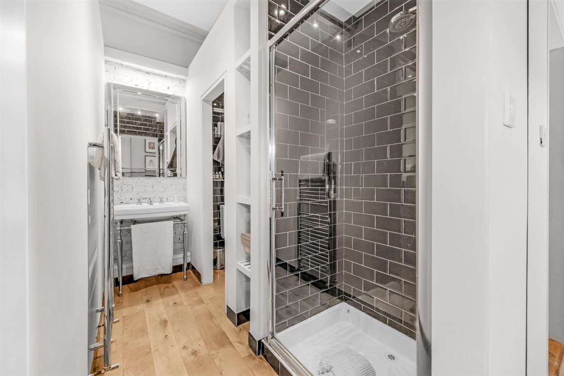 Upstairs, the hall return hosts a practical utility area, a beautifully appointed bathroom with a freestanding cast iron bath, and a double bedroom currently used as a home office. On the upper floor, two elegant double bedrooms each feature en-suite shower rooms, with the principal bedroom spanning the width of the house and boasting a cleverly designed ensuite that preserves its impressive Victorian proportions.