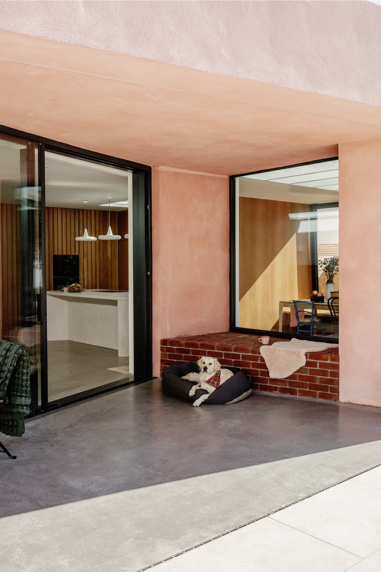 Although most of us enjoy picking out paint colours for inside our home, it’s rarer to see people use colour in their outdoor spaces. This pink-hued extension shows the warmth and joyful mood colour can bring to a garden.