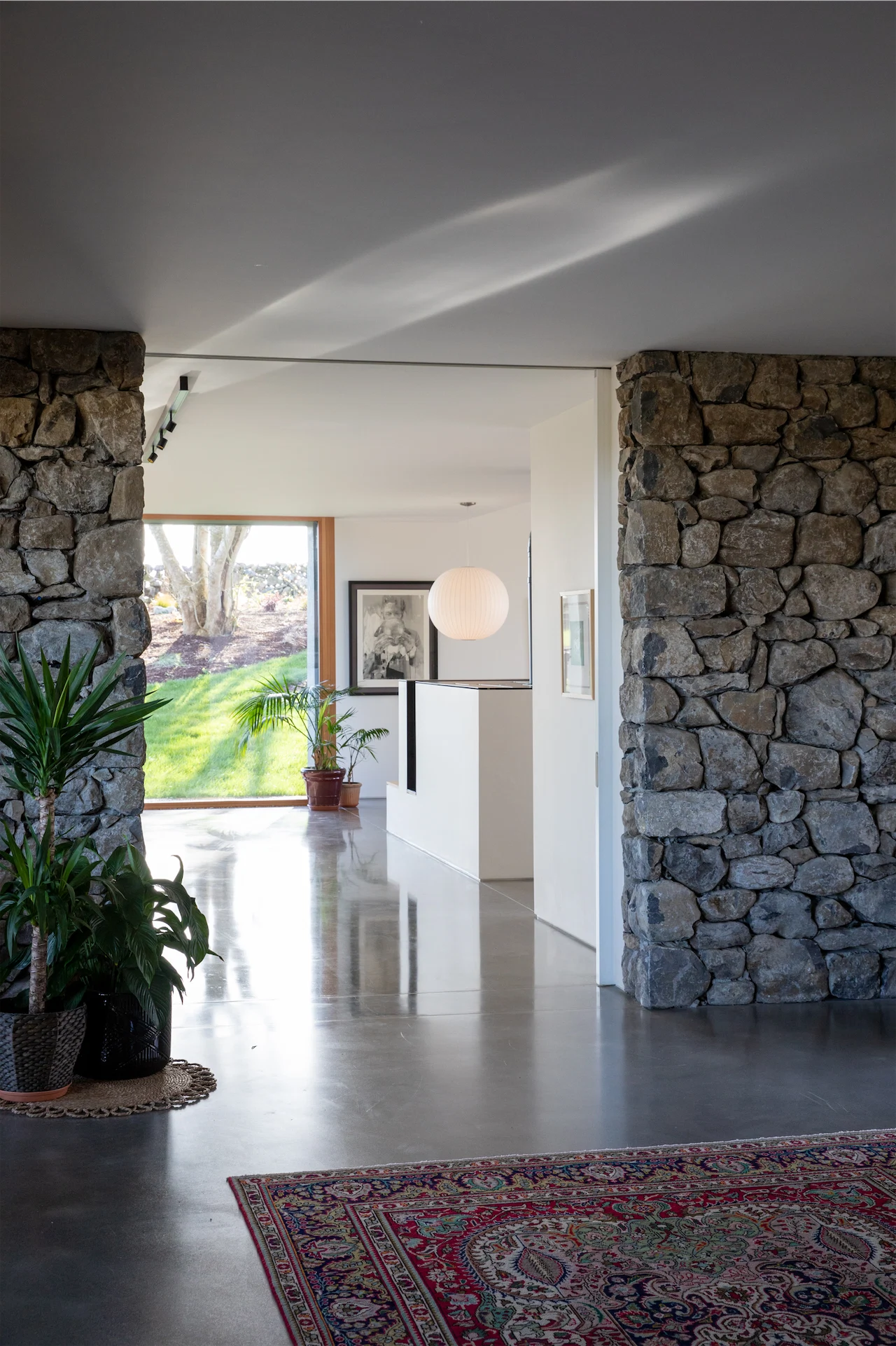 This can come in many forms, such as continuing a tiled floor out to a patio space, taking a wood colour in your kitchen as inspiration for fencing, or as done here, concrete and stone walls appearing both inside and outside.