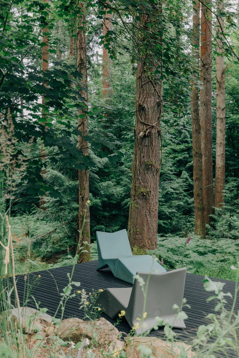 Decking sits above the ground level, allowing ferns and trees to gently overhang, while large rocks mark off a small patio space.