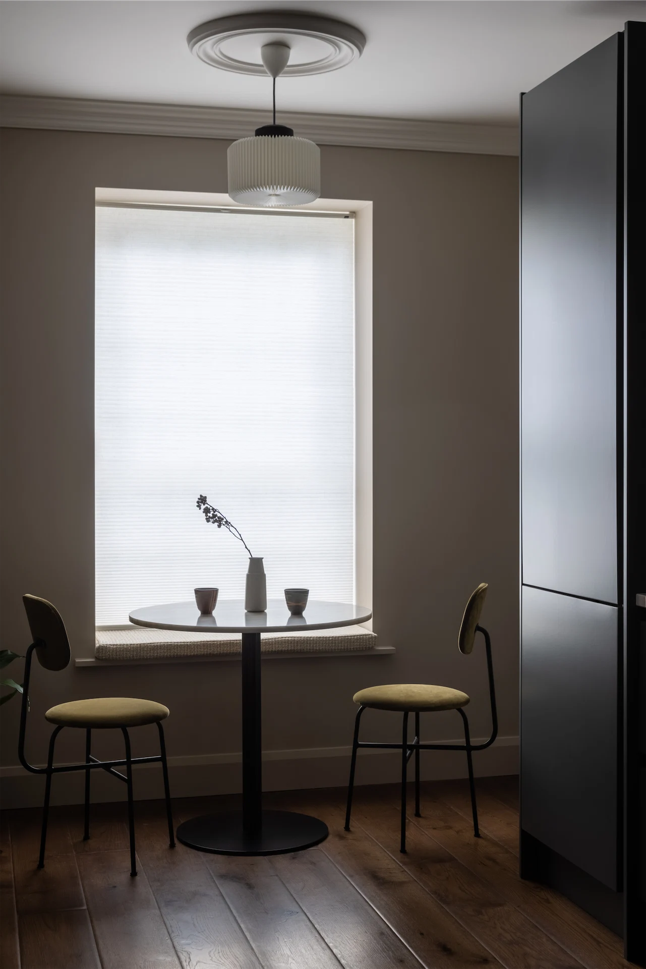 She explains that because the apartment doesn’t get much natural light, she decided to lean into this and choose a richer colour and material palette, such as smoked oak floors and furniture, black fixtures and fittings, and rich tones on the walls.