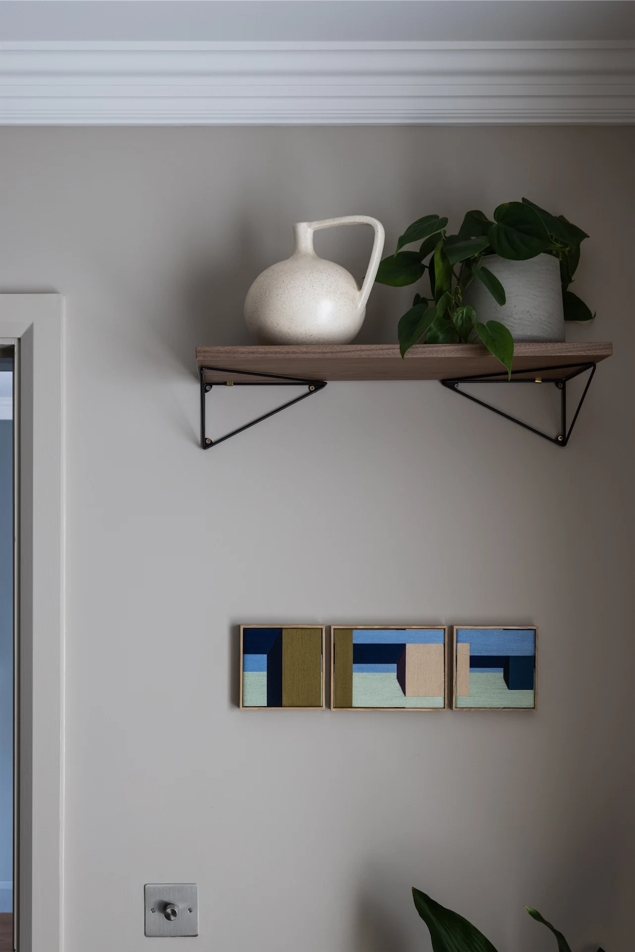 “The textile pieces by UK artist, Jo Elbourne were chosen for their geometric patterns that relate to the built environment, and as the apartment is located in Monkstown we sourced a framed photograph by Dublin based photographer, Steve Turner, that depicts Seapoint at high tide.”