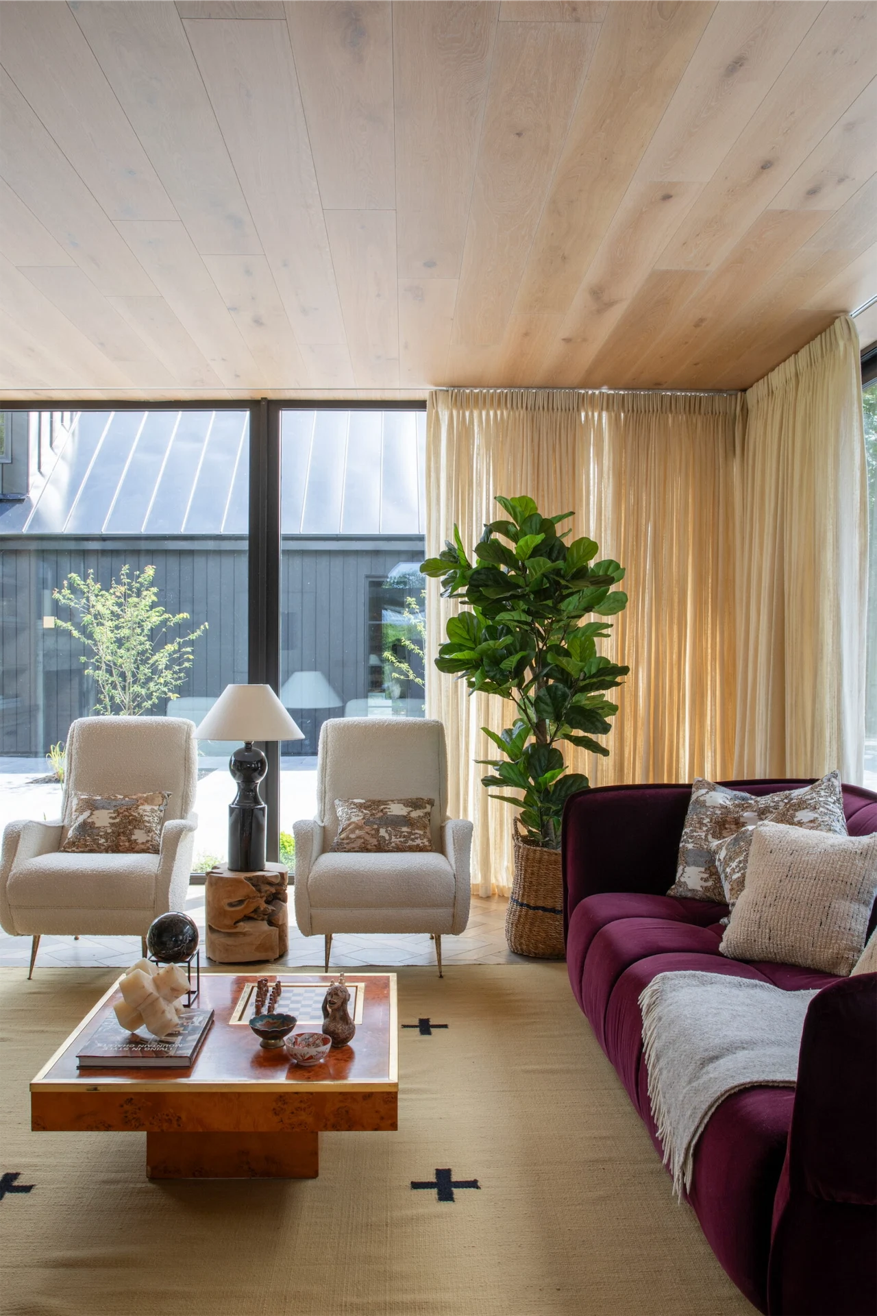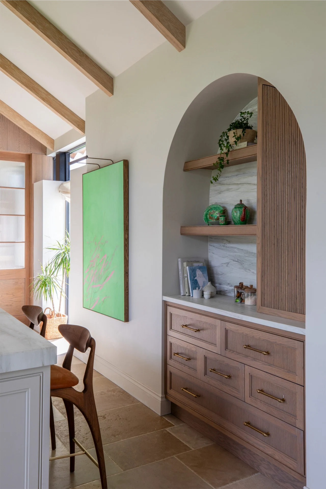 “Good materials have inherent characteristics and beauty. We installed French tumbled limestone on the floor that has variations in colour which I love, and the island has Calacatta gold marble.” The natural tones are continued in the banquette, a curved oak bench upholstered in sage green mohair fabric.