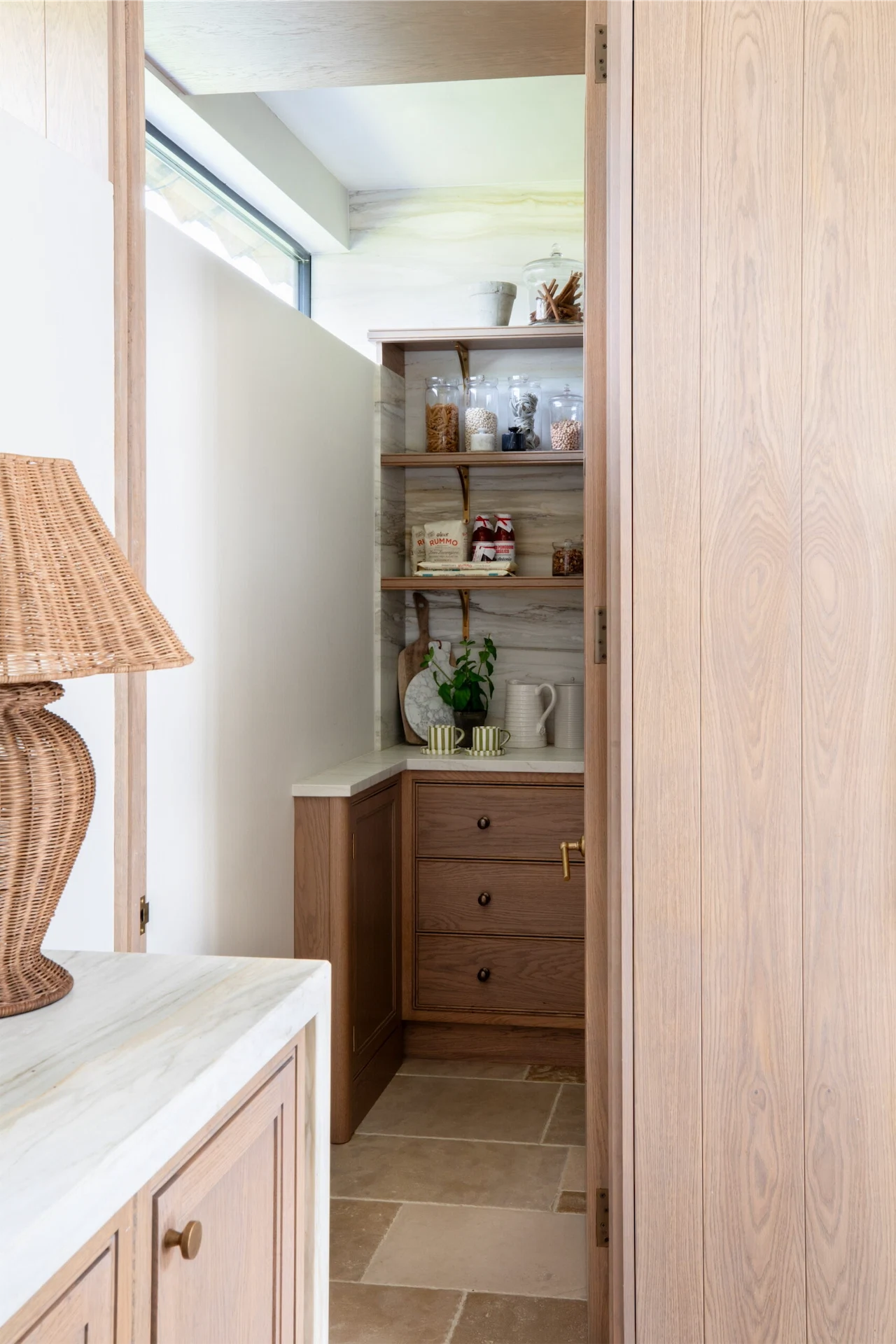 An island that stretches to almost four metres is the centrepiece of this space, while a walk-in pantry keeps clutter out of the main kitchen. “I love the natural materials in the space,” Geri says.