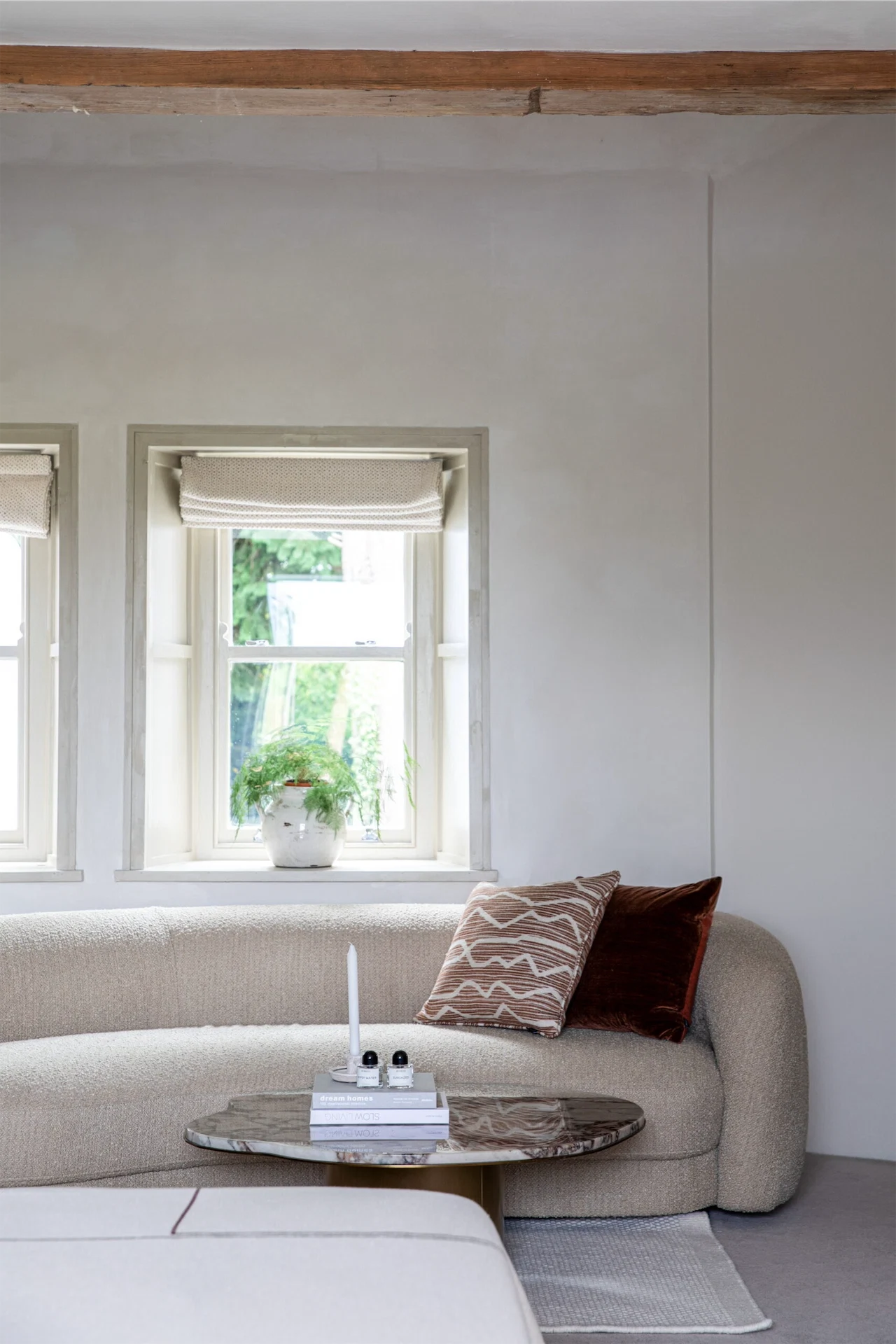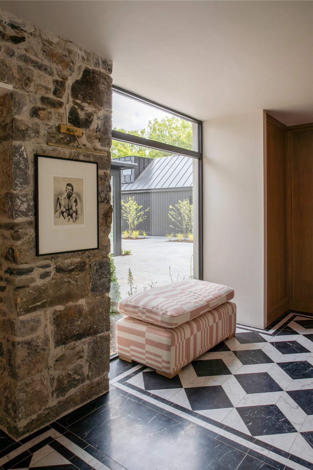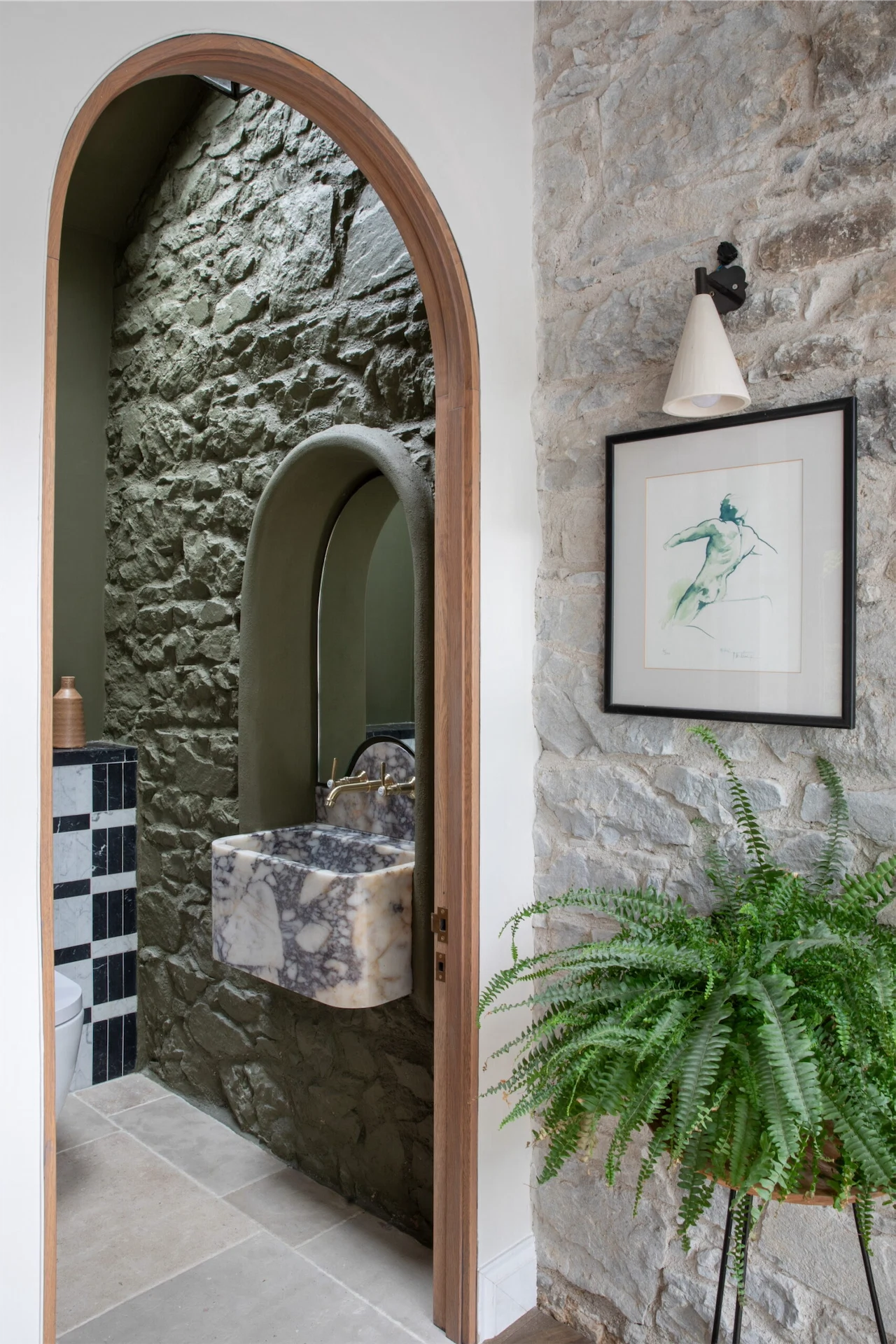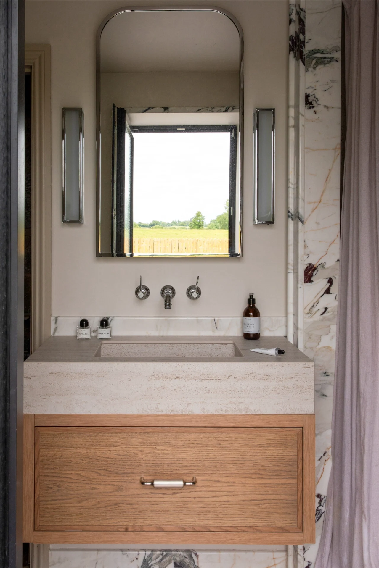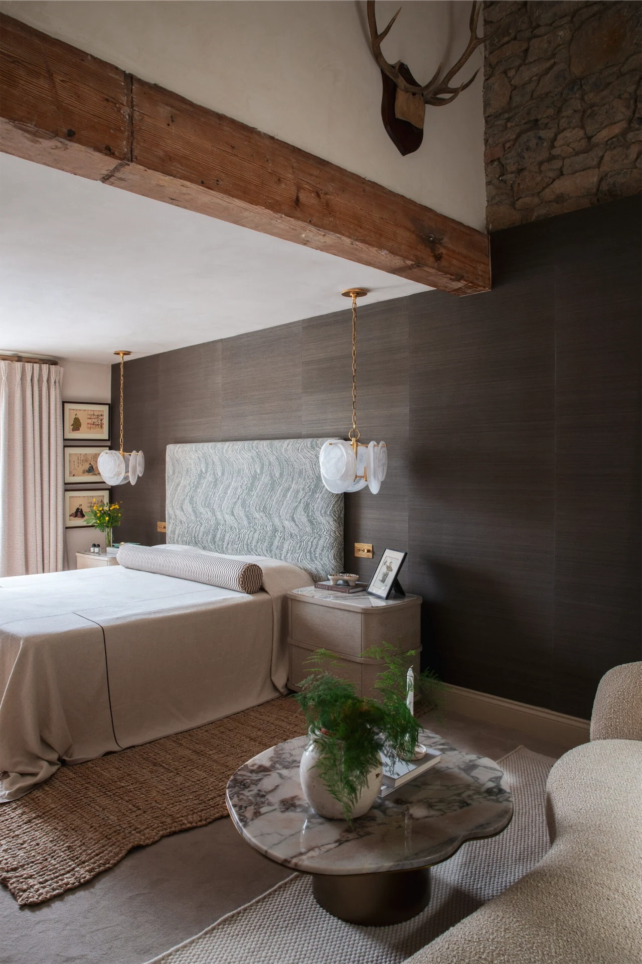 Elsewhere in the home, Geri’s eye for design is on full display. “I love to lean on interesting materials to give interiors a depth,” she explains. “I designed a pattern for the floor in the entryway in Nero Marquina and Carrara marble for some impact, and this juxtaposition with the rustic stone and oak doors means that even though it’s neutral, there is a lot going on which I love.” Colour is added through art and fabric, but she has kept the main materials in soft neutrals, ensuring a calm, restful mood.