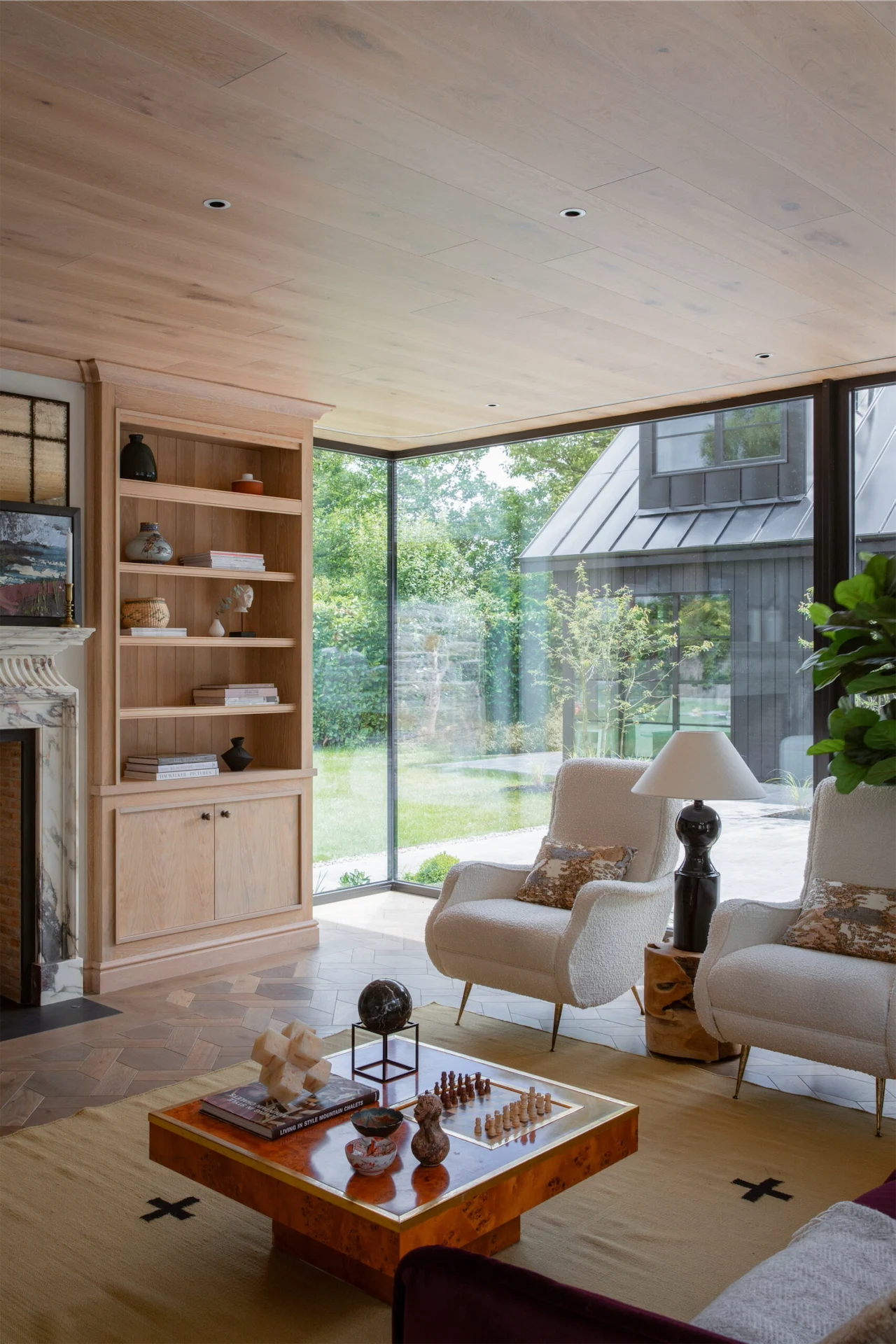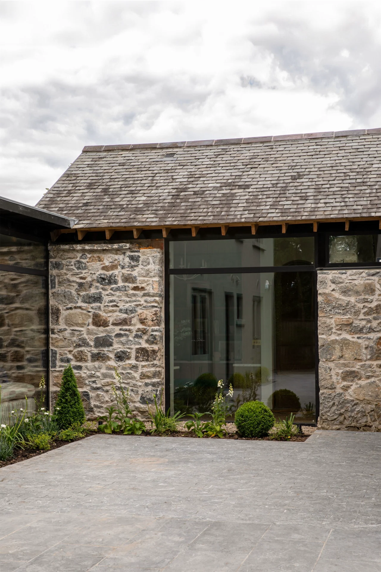 The original cottage is now linked to what was once a cow shed, and forms the kitchen and dining space, while a glass-walled extension became the new living space. Although the space obviously needed extensive work to incorporate it into the cottage, it retains a sense of what it used to be, with exposed stone gable walls still visible, and a vaulted ceiling that emphasises the height and space of the generous room.