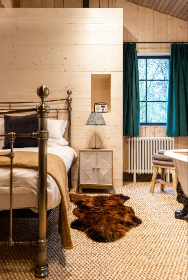 We worked together on the previous project, Cabü by the Sea in Kent, and we wanted to make it relevant to the location. So Cabü by the Sea is down near Dungeness on the Kent Coast, but it has the Dungeness coolness to it, so what we went for there was relevant to its setting. Now certain items we have cross-written to this site as well to remain brand consistent, like the Falcon enamelware, which has a lovely silhouette against the architecture of the cabins. It is very fitting, but we have used more of an earthy woodland feel here in Cavan.