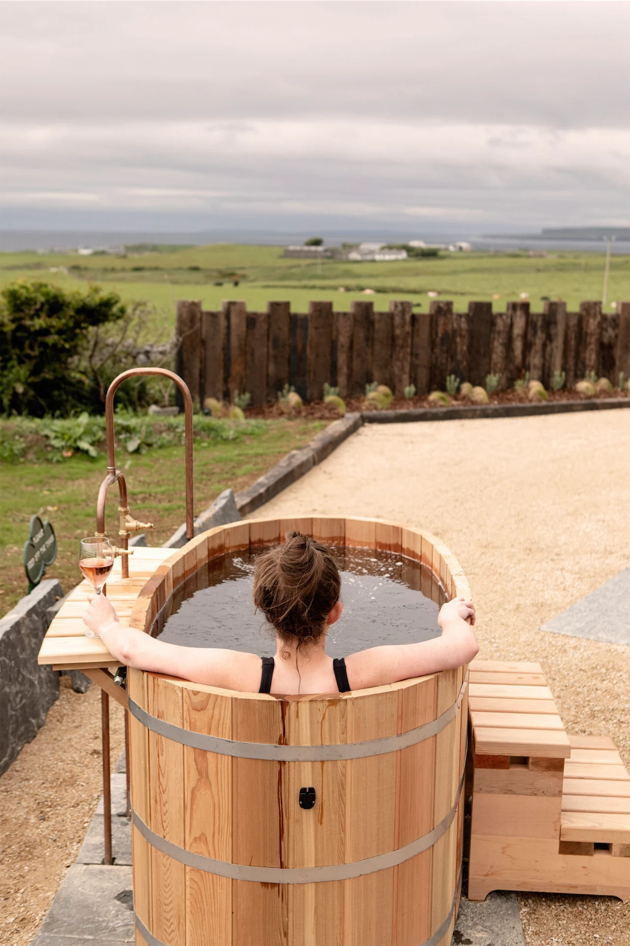 A solid-fuel stove is ready to be lit in colder weather or to warm yourself up after an outdoor seaweed bath (or after you’ve braced yourself under the plunge bucket!).