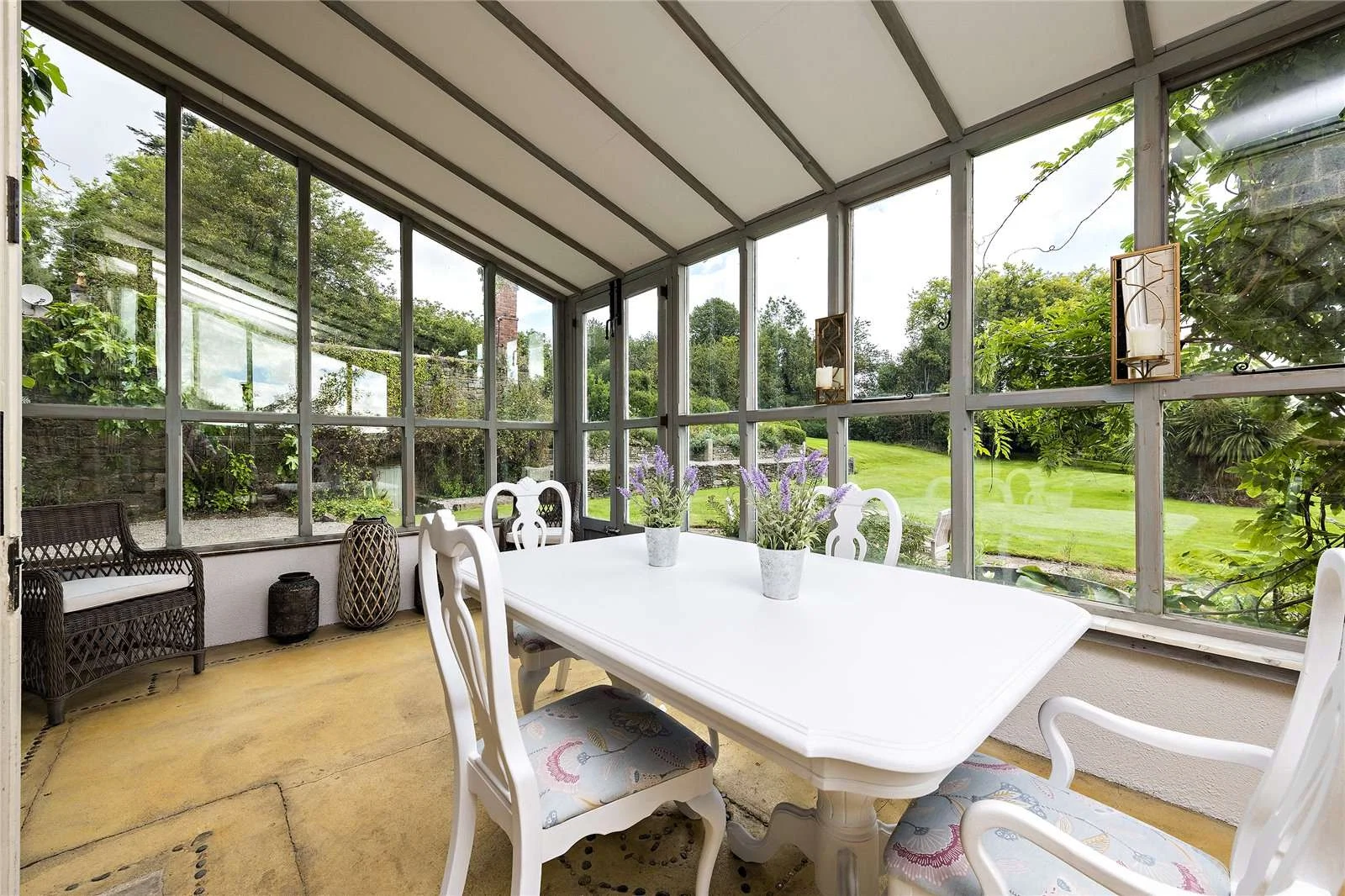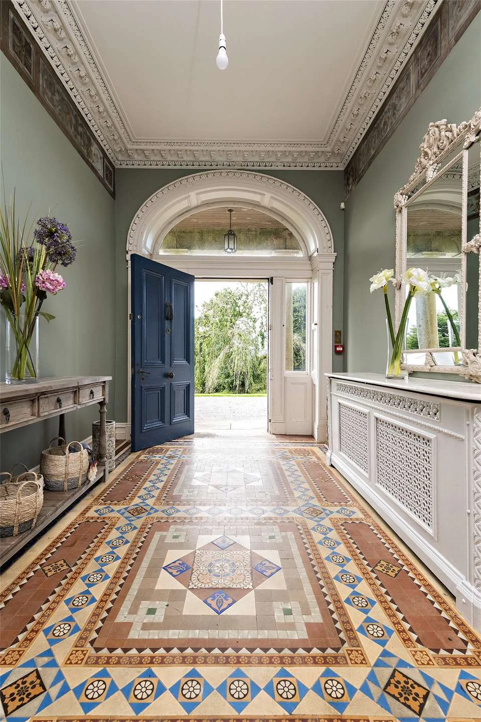 Aughrim House is secluded and quiet, a winding private road leading under a stone arch and into the gravelled courtyard. Up the stone steps and through the front door is a light-filled hall, which divides the south-facing drawing and living rooms. Both still boast a number of period features including corniced ceilings, centre roses, and magnificent open fireplaces.