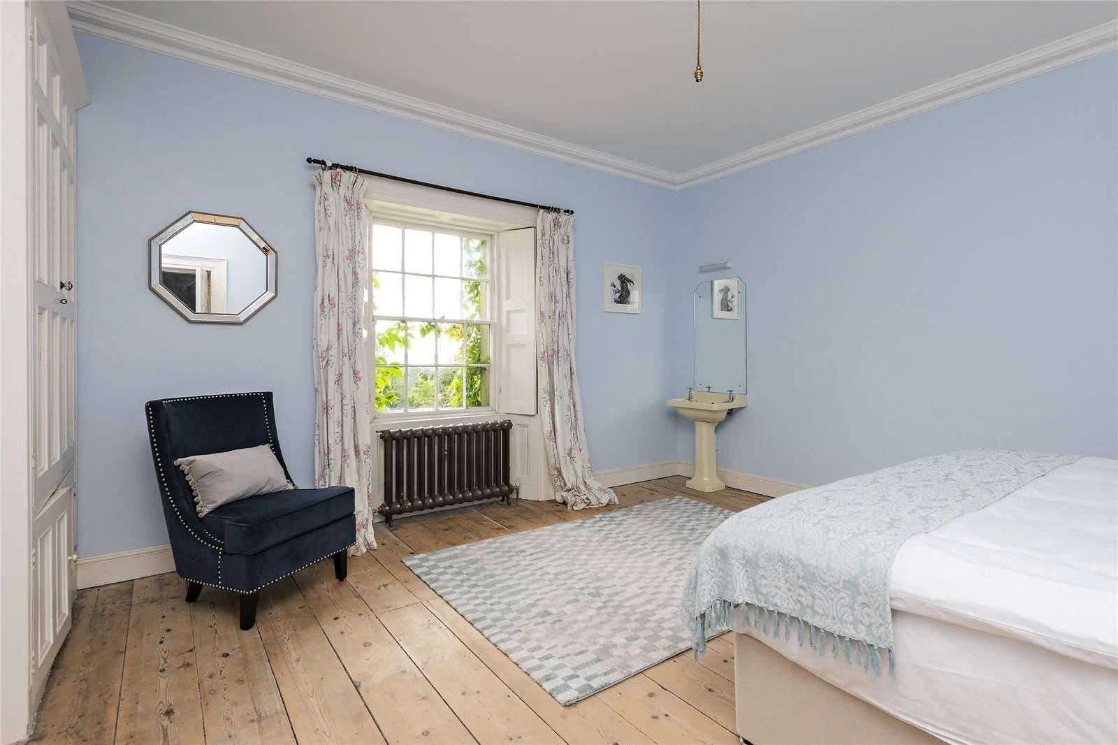 Through the drawing room is a large conservatory on one side and the dining room, access through ornate folding doors. The kitchen is located off the living room and overlooks the rear courtyard through large sash windows. It is large and spacious with an AGA range as well as a modern Bosch cooker. Tucked off it is a considerable pantry with a double Belfast sink.