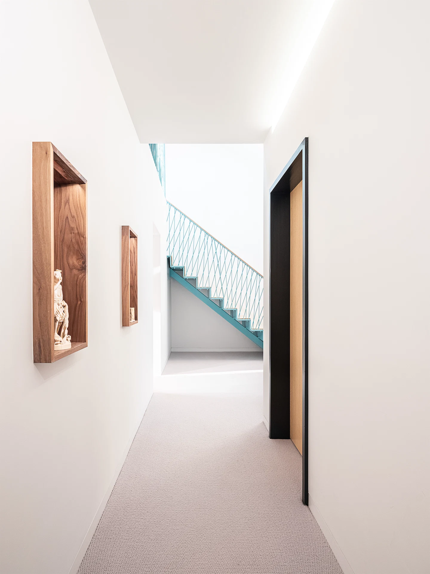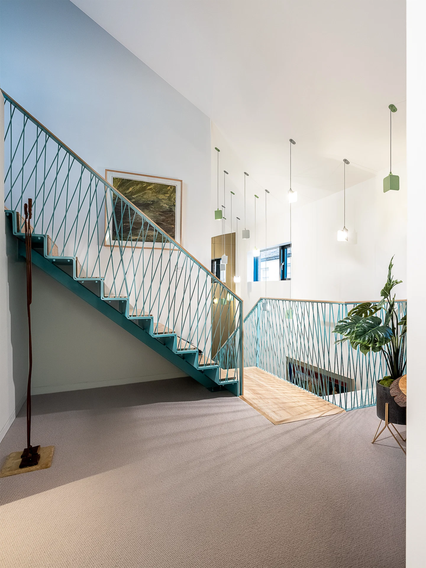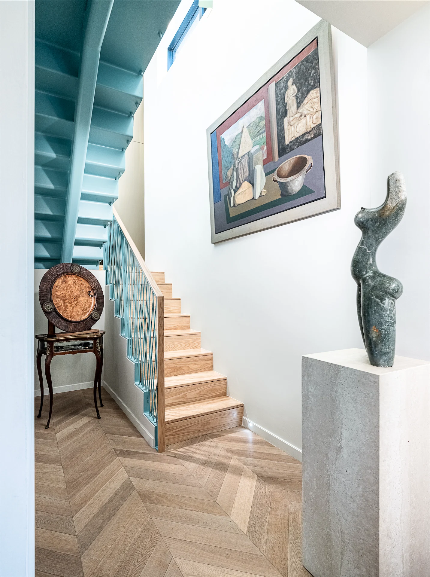 Emily explains that they chose a palette of monotone earthy neutrals, while colour was added through the furniture and the duck egg blue folded steel staircase and balcony railings that run through the house.