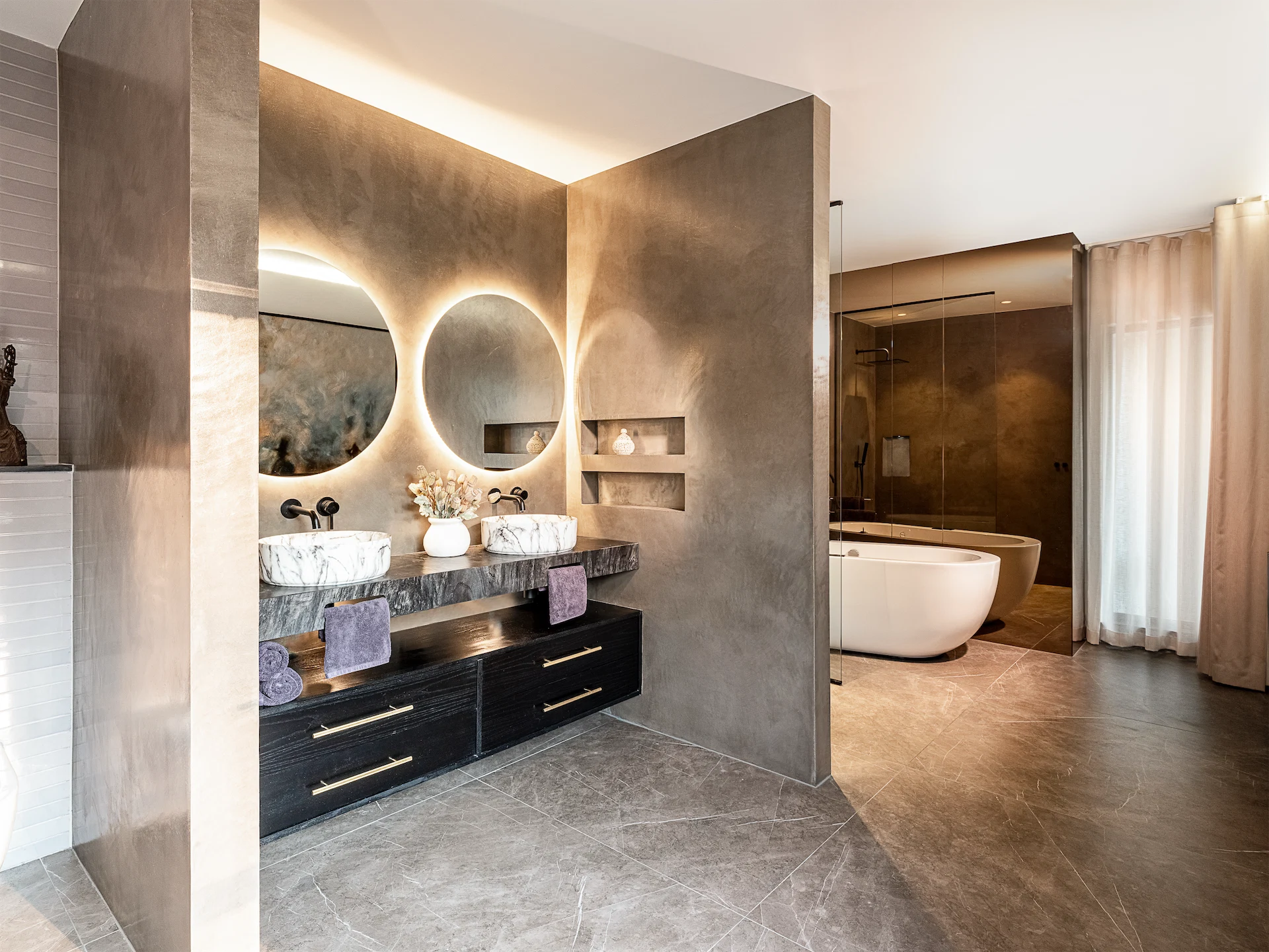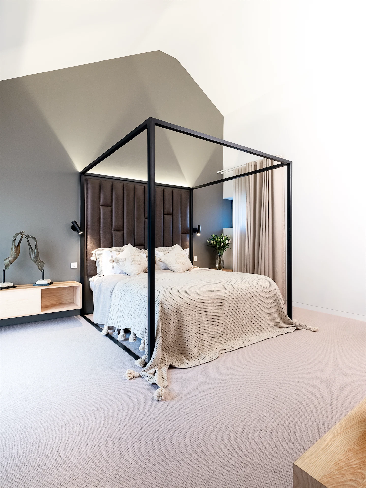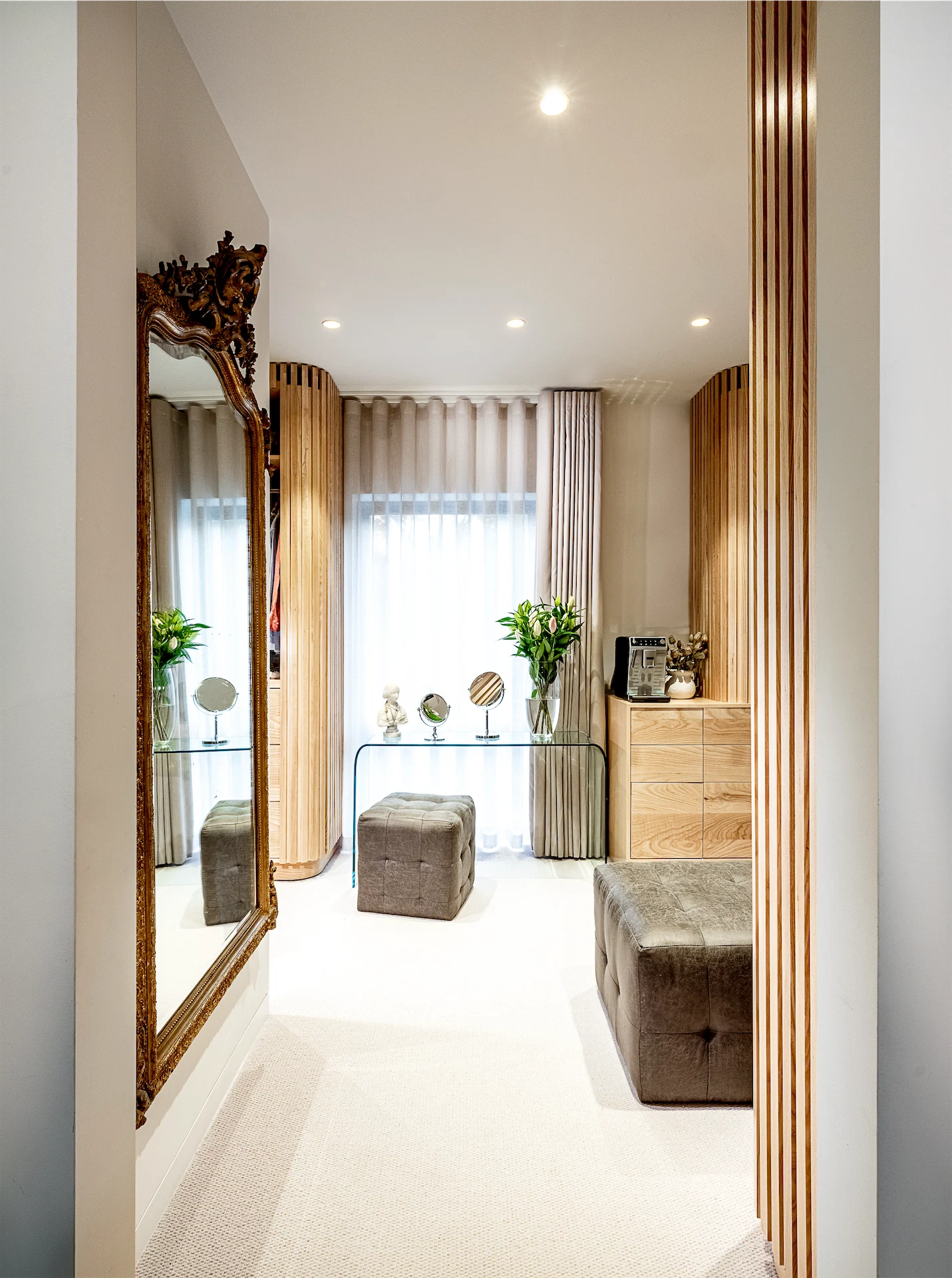 The result is a space that feels “peaceful and grand”, she says. “The softness of the voile curtains throughout and the muted colour palette lend themselves to a hotel-like feel, so that you immediately feel relaxed as soon as you enter the space.”