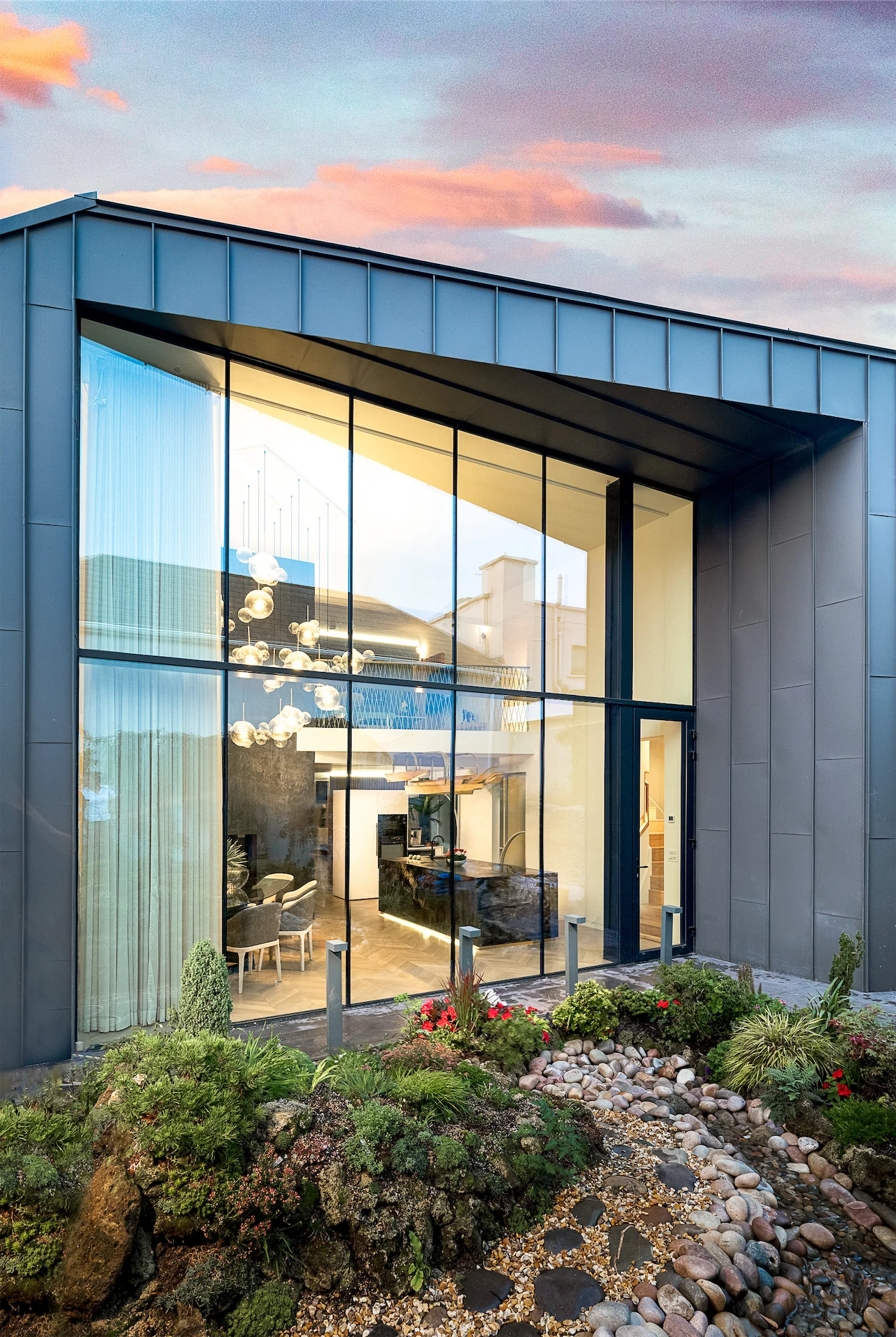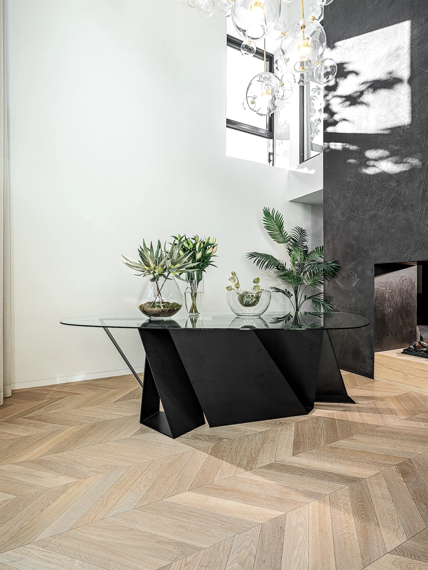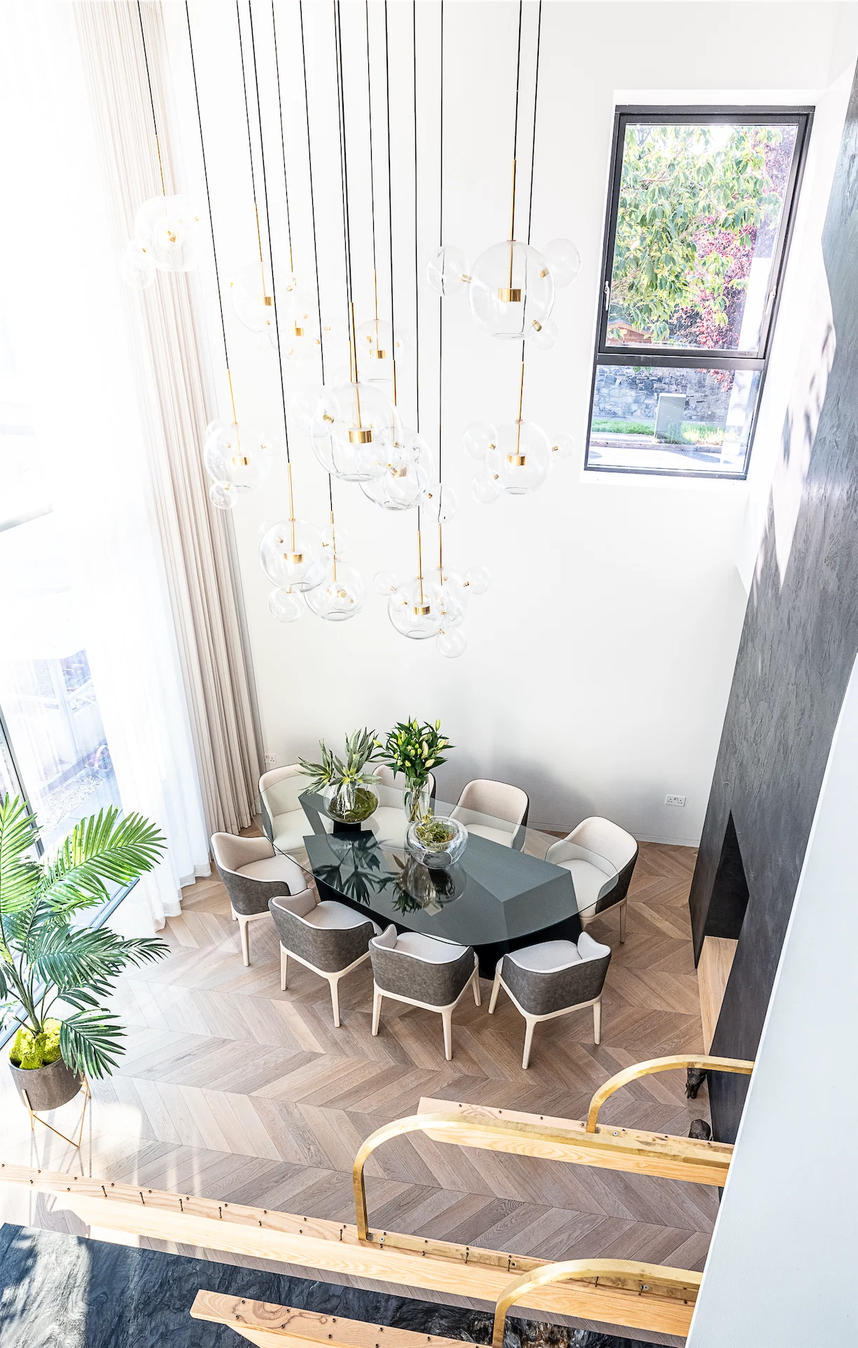 The dining space features a bespoke table made from folded aluminium with a glass top. Above it sits a feature light piece which hangs over three metres from the triple height ceiling.