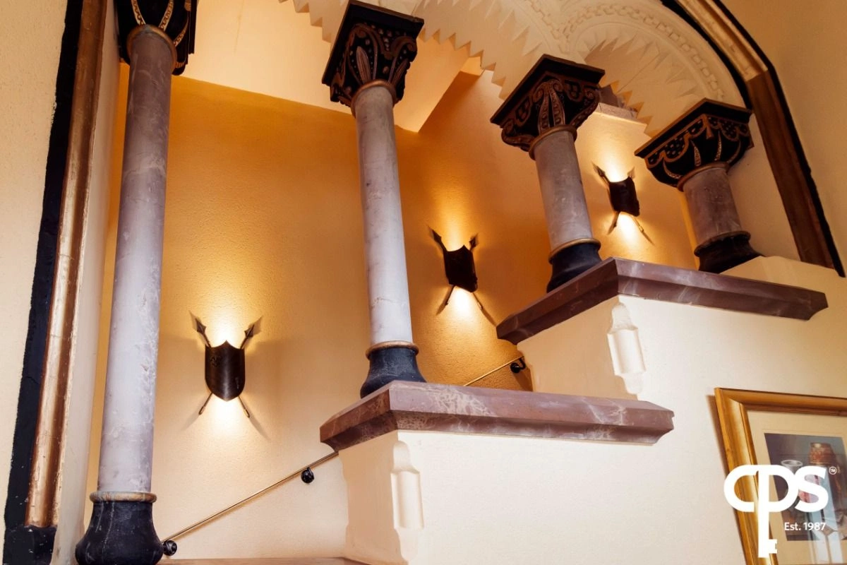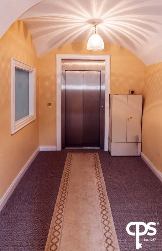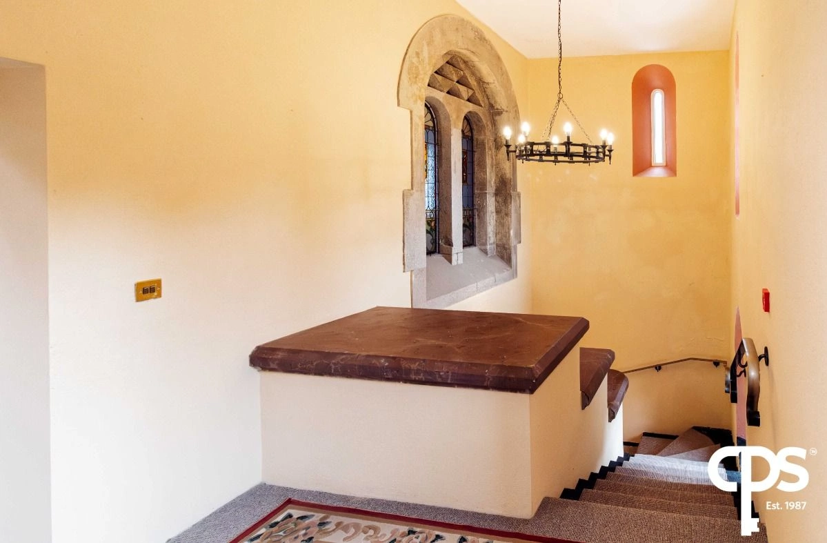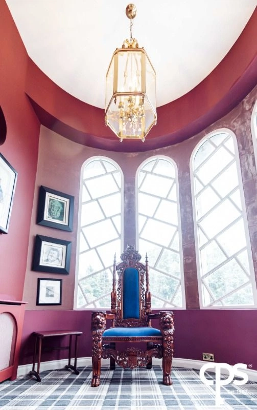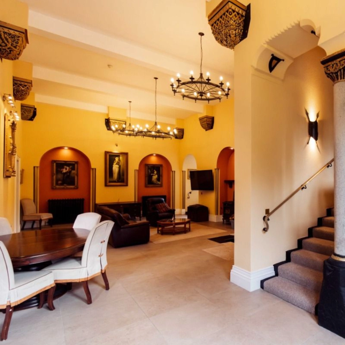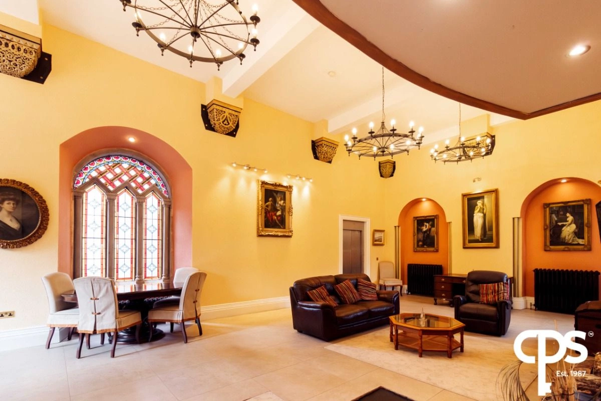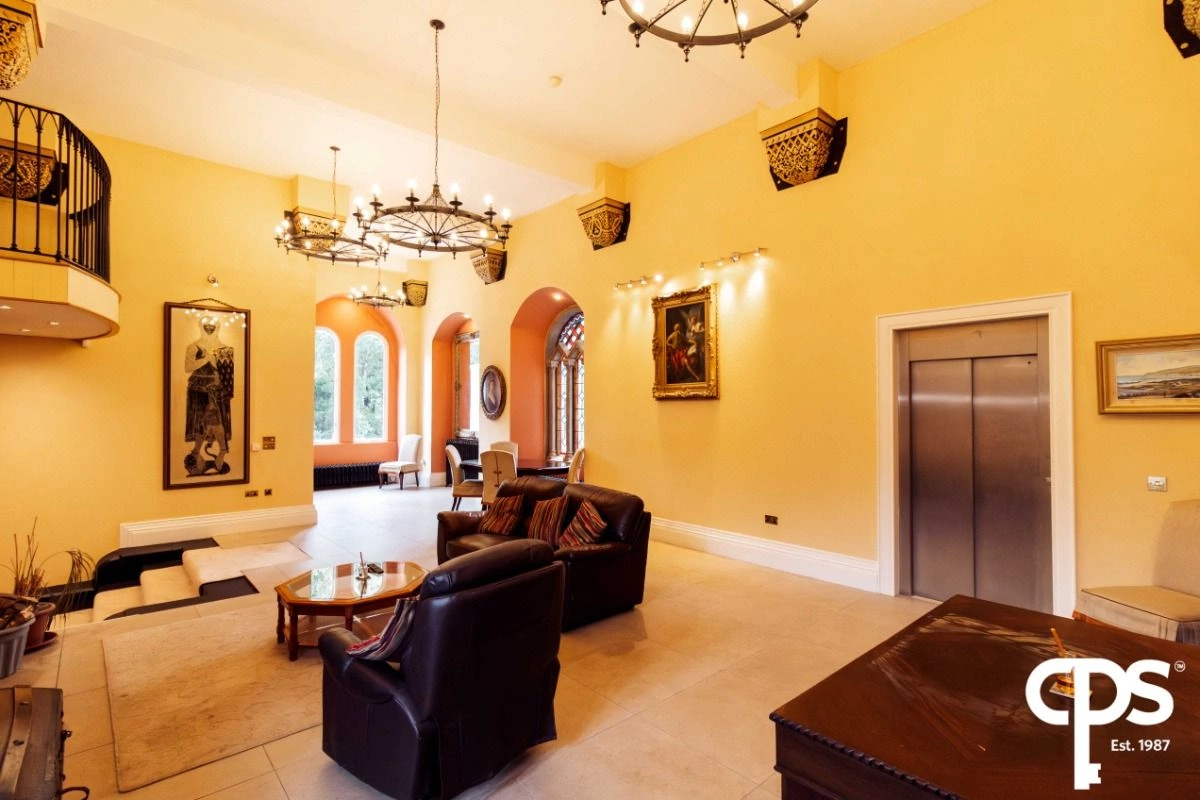 The centrepiece of the property, the foyer is an expansive living space with high ceilings and medieval-styled chandeliers. Within, there is a lift which can take you to the remaining floors.