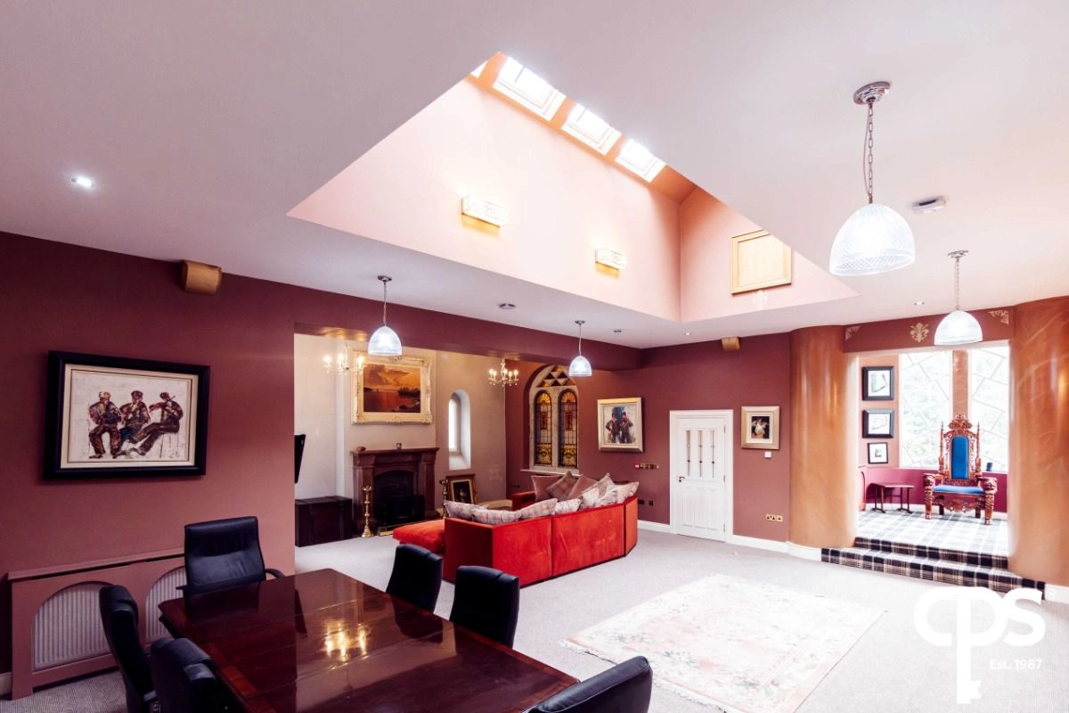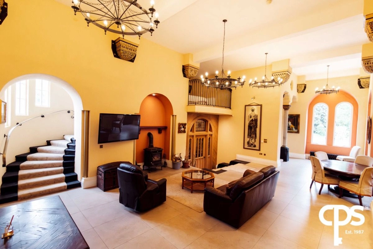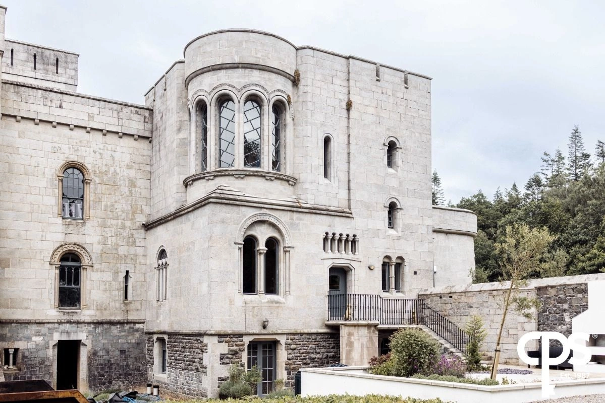 Externally, the property is accessed via two automatic gates. A grand entrance leads up to the front of the property. A lawned garden can be found to the side of the original castle, while to the rear of the property, there are private parking facilities and a recently built entertainment area with stone patio space for a table and chairs. Within the rear garden is a concrete-constructed barbecue and raised stepped balcony leading you to the rear entrance of the property.