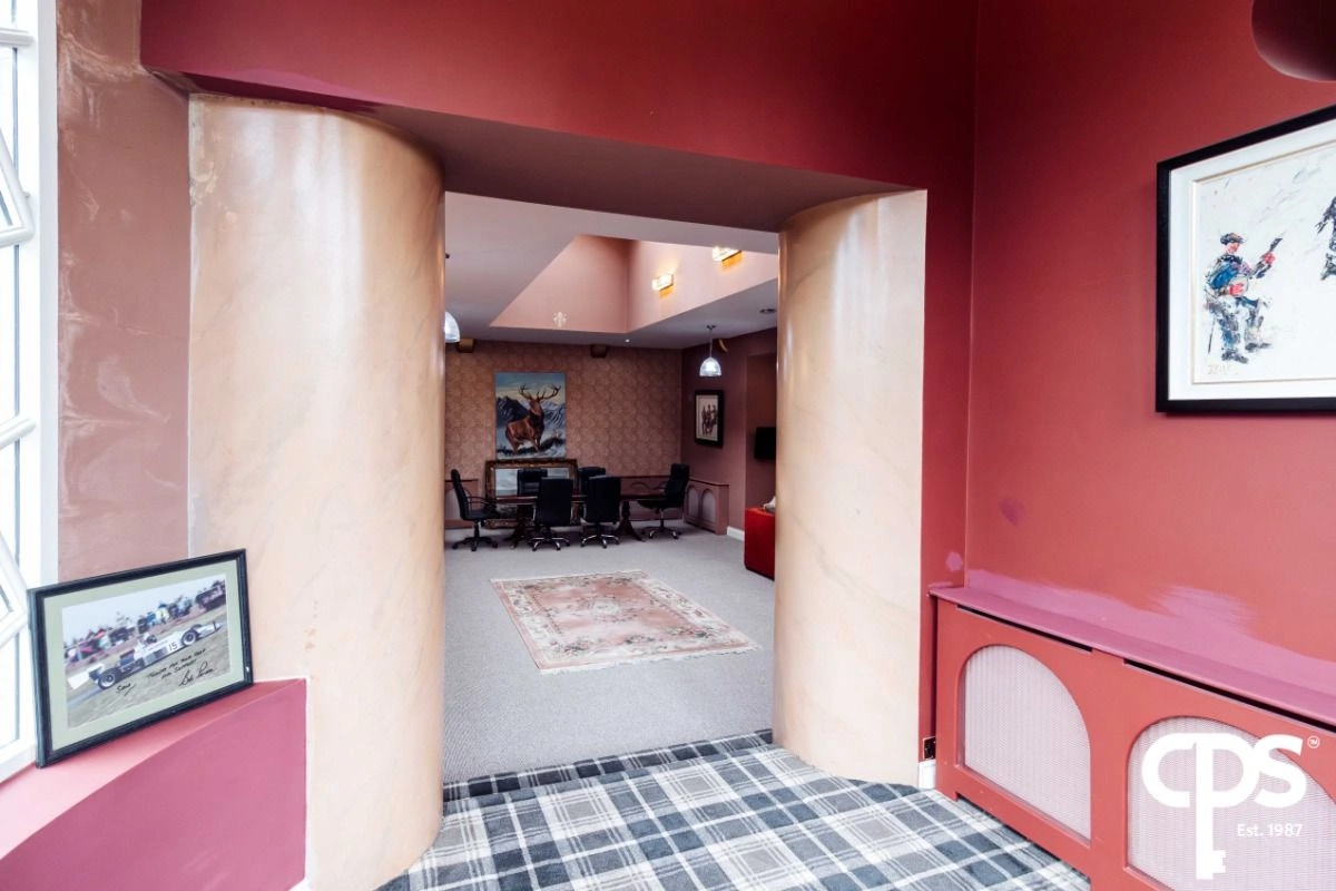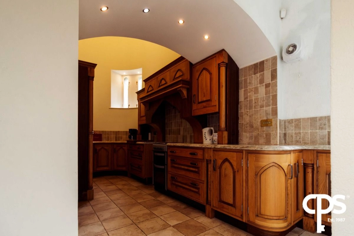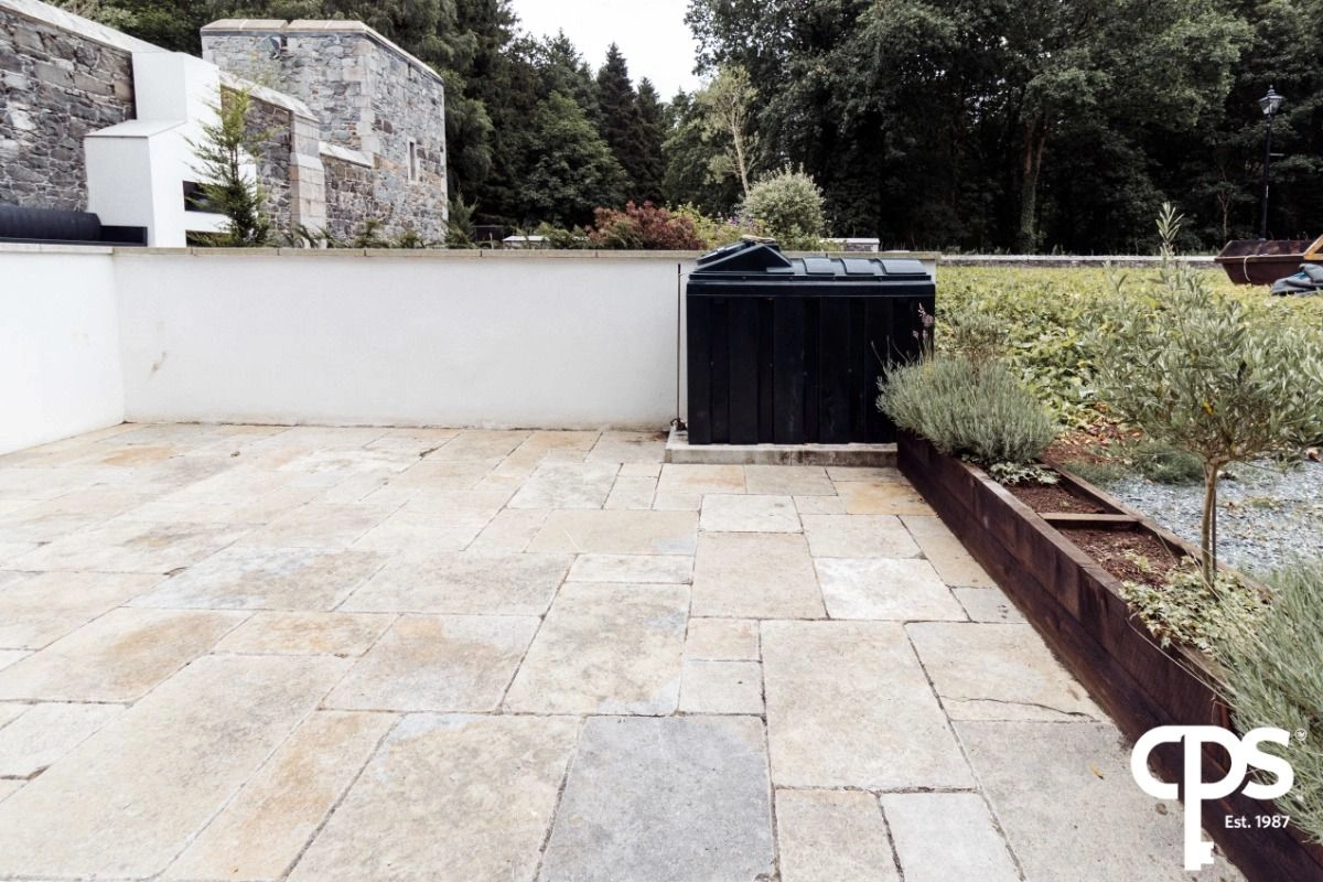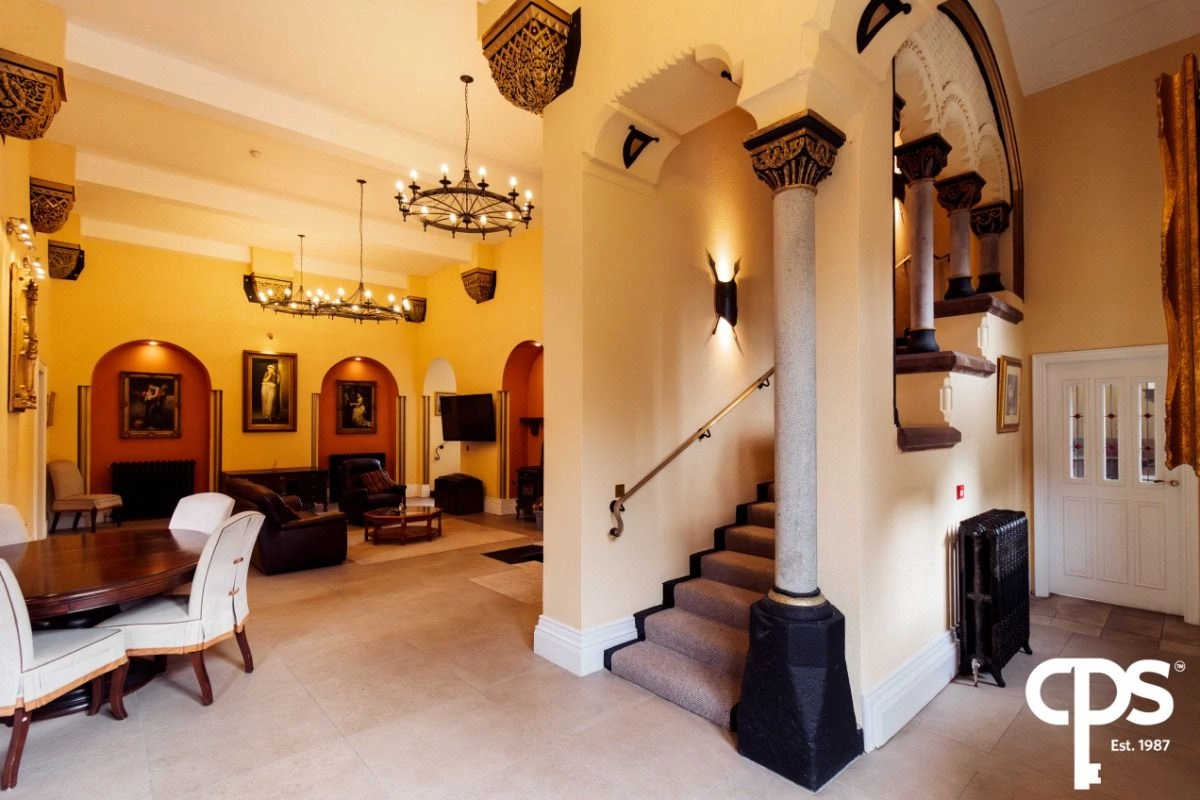 Externally, the property is accessed via two automatic gates. A grand entrance leads up to the front of the property. A lawned garden can be found to the side of the original castle, while to the rear of the property, there are private parking facilities and a recently built entertainment area with stone patio space for a table and chairs. Within the rear garden is a concrete-constructed barbecue and raised stepped balcony leading you to the rear entrance of the property.