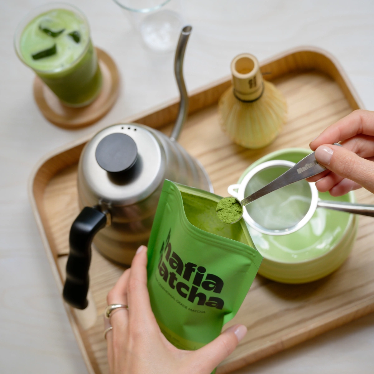 The perfect matcha starts with quality tea (Mafia Matcha, of course), water at 70–80°C (hot, not boiling), sifted powder, and a proper whisk with a bamboo chasen until a dense foam forms. If you’re making a latte, the base matters, matcha is a suspension, so I love using a high-quality barista oat milk (Rude Health Barista is my go-to).