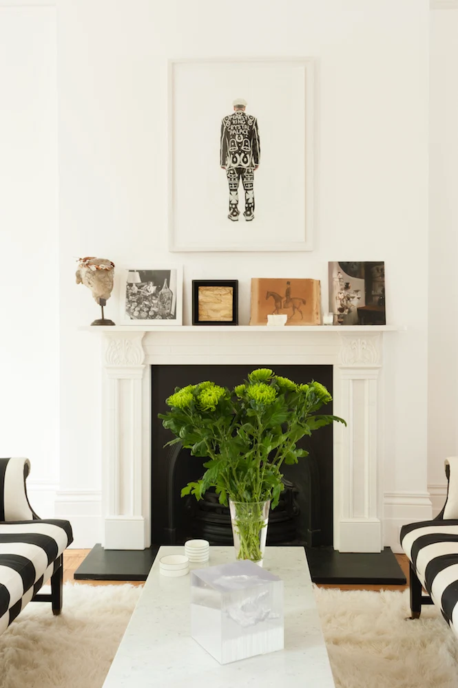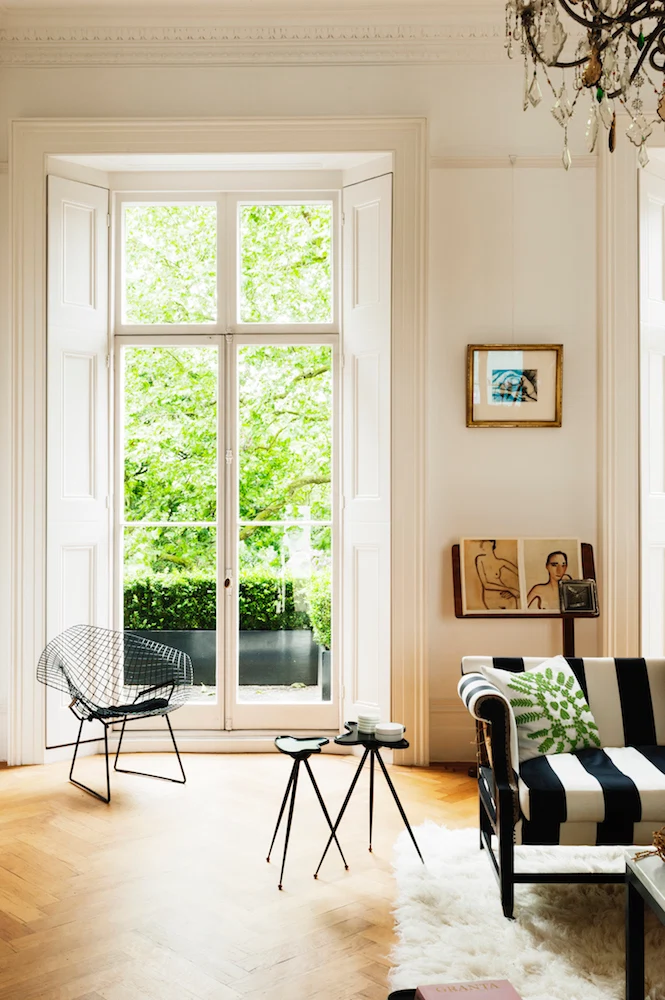 The living room is arguably the most formal part of the house with a darker floor and classic English sofas covered with white and black canvas. The windows offer views through to the trees in the square, showing off their original shuttering, while a modern chandelier and small tripod side tables offer a counterpoint to the classic marble fireplace.