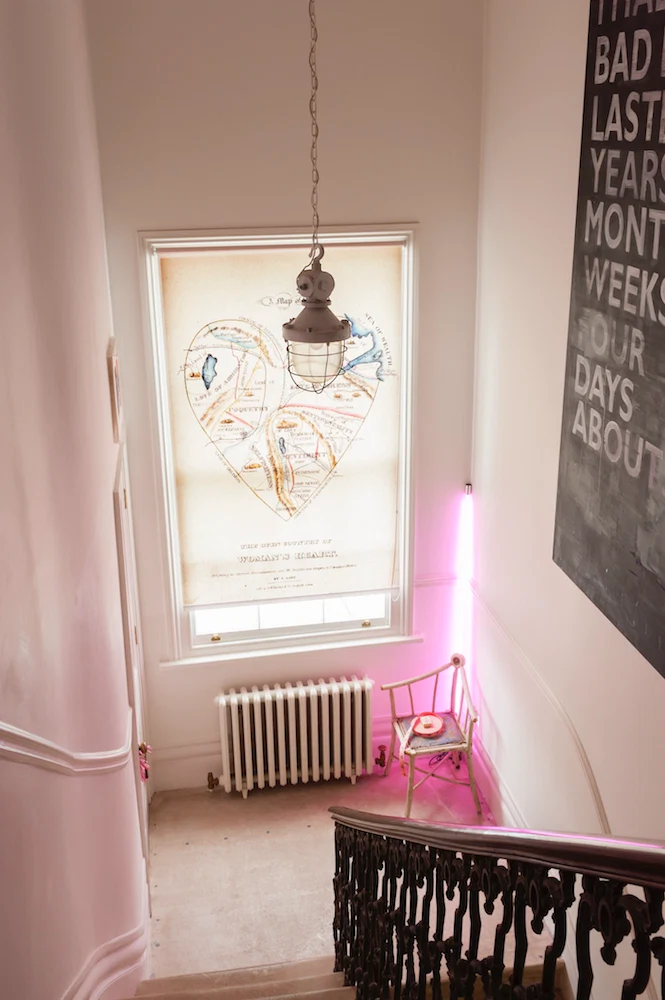 Audacious in her approach, Harriet removed partition walls, exposing the original staircase, and created a giant blank canvas of three floors upon which to draw her vision. She “loves Scandinavian styles” and this is very much illustrated by the background of the house – the bare wooden, often greyed floors, the large swashes of whites on the walls, the preference for the use of shutters and blinds rather than pelmets and looming curtains.
