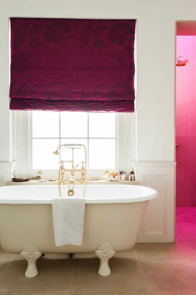 The reclaimed Victorian bath in the master en-suite is from Drummonds and the canopy blind is in Lorca’s Florentine damask by Osborne & Little.