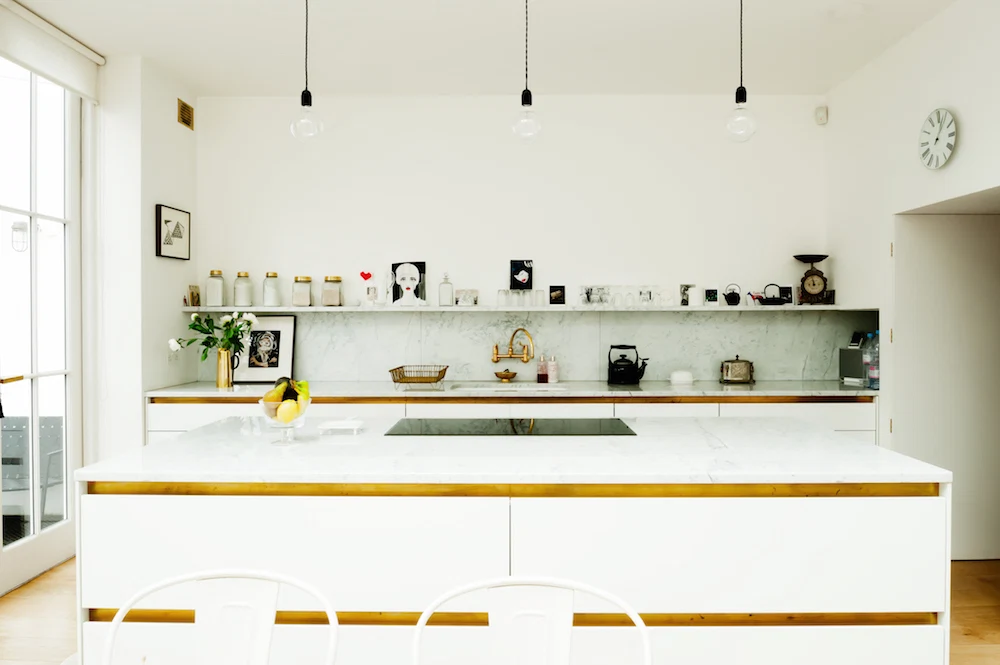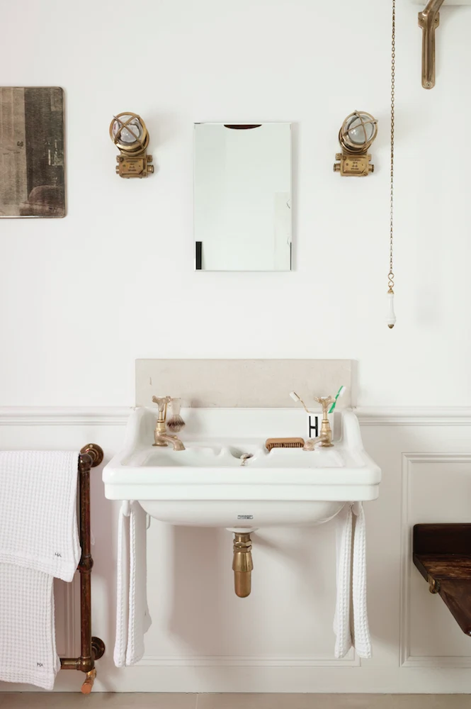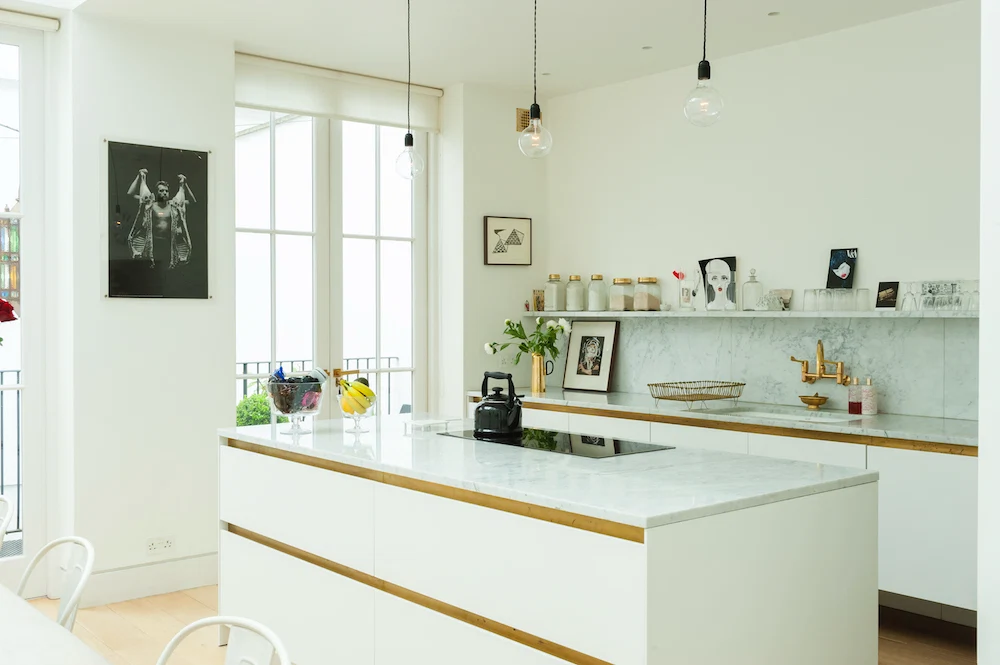 In the kitchen, Harriet selected brass bands to match the brass taps originally sourced via eBay. The kitchen units come from Bulthaup.