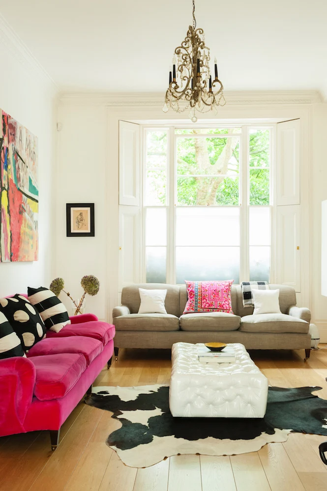 In the family room, the George Smith sofas are upholstered in pink, the table in the centre is by Meret Oppenheim for Cassina.