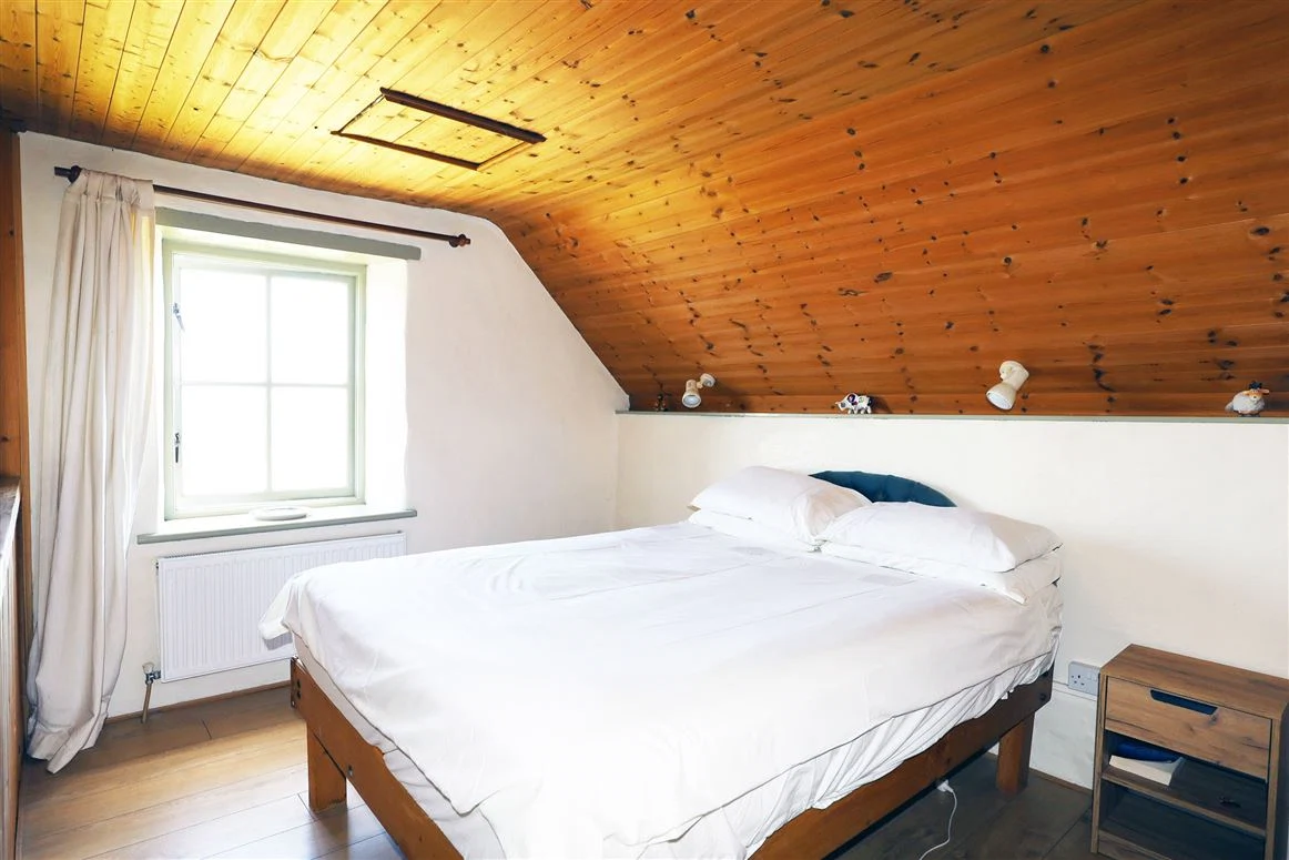 This space boasts wooden floors and ceilings, and access to the back garden and patio area. The downstairs bathroom has tiled floor and walls, and the downstairs bedroom overlooks the front garden.