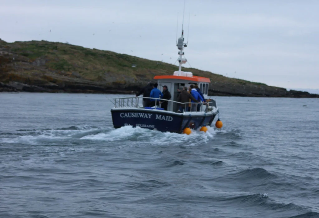 As we chugg out to sea, Wendy talks enthusiastically about the surrounding coastline which being the north Antrim coast is every bit as dramatic as Game of Thrones would lead you to believe. Looming rocky cliffs of dramatic dark basalt and white chalk tower over the crashing waves beneath. Wendy points out the remains of Dunluce Castle which hangs precariously close to the cliff edge and the spectacular Mermaid’s Cave cavern 25 metres below. The kids love listening to Wendy regale the local legend that the castle’s final aristocratic resident, the Earl of Antrim’s wife, was so horrified when her kitchen fell into the sea, that they abandoned the castle that very night.