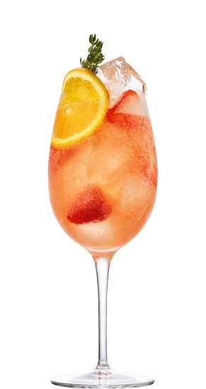 Build ingredients in a glass over cubes of ice and gently stir to combine. Garnish with an orange wheel, thyme sprig and strawberry slices.