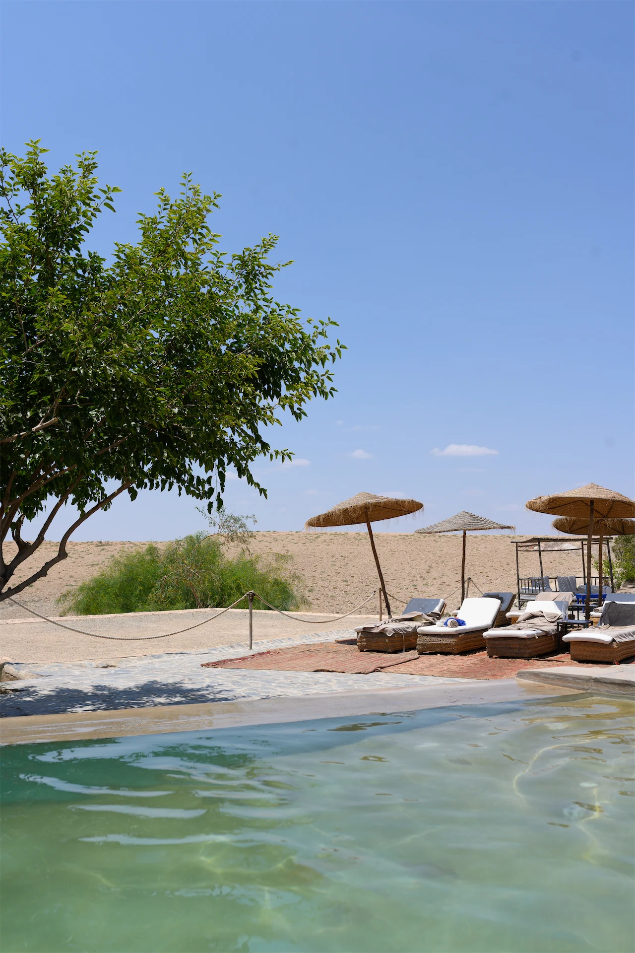 The camp has two outdoor pools built into the terrain fed from desert springs, so there is always somewhere to cool off, which is most welcome. The relaxed and airy Olivar restaurant serves breakfast, lunch and dinner, drawing on their own gardens, Moroccan and Middle Eastern dishes. Gorgeous Lahcen, the head gardener, will show you the vegetable and fruit garden, which he planted with vines for shade. Sheep and goats are also raised on site as are hens for fresh eggs. Horse-riding, bread making, yoga, cycling, tea ceremonies and stargazing are all on offer during your stay. There are relaxing, nurturing vibes in this beautiful desert camp.